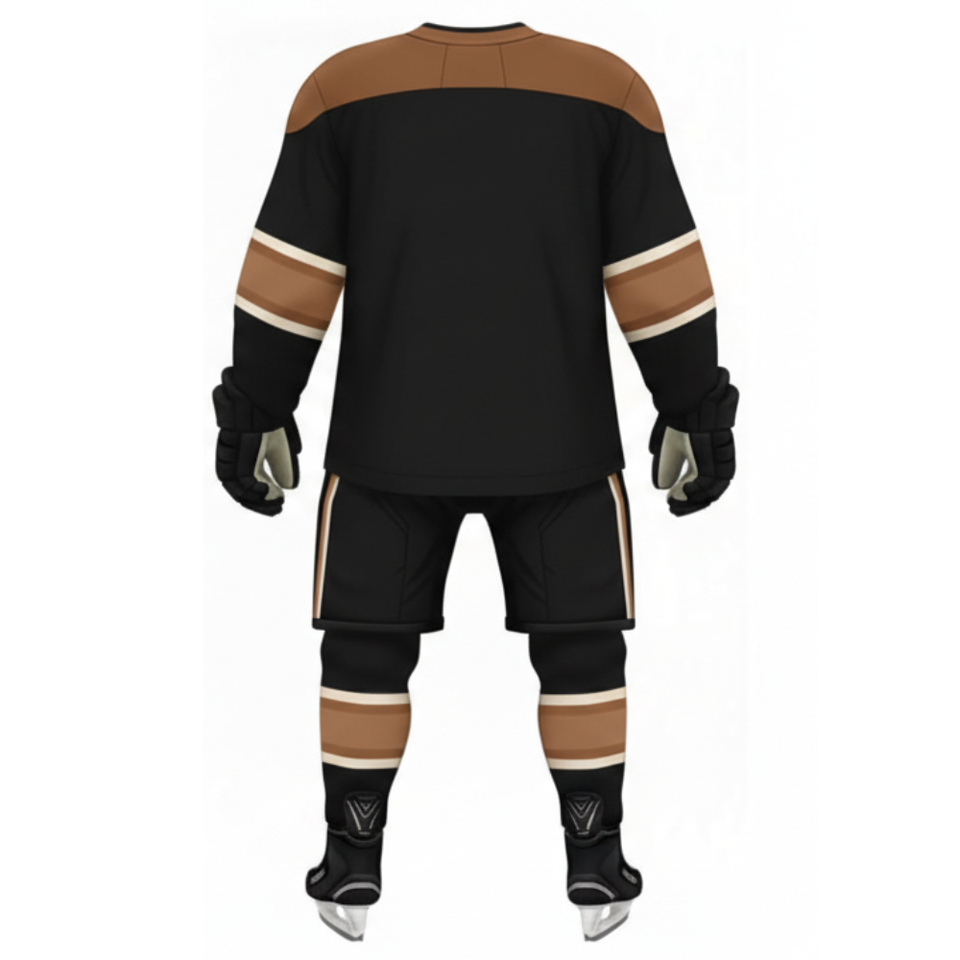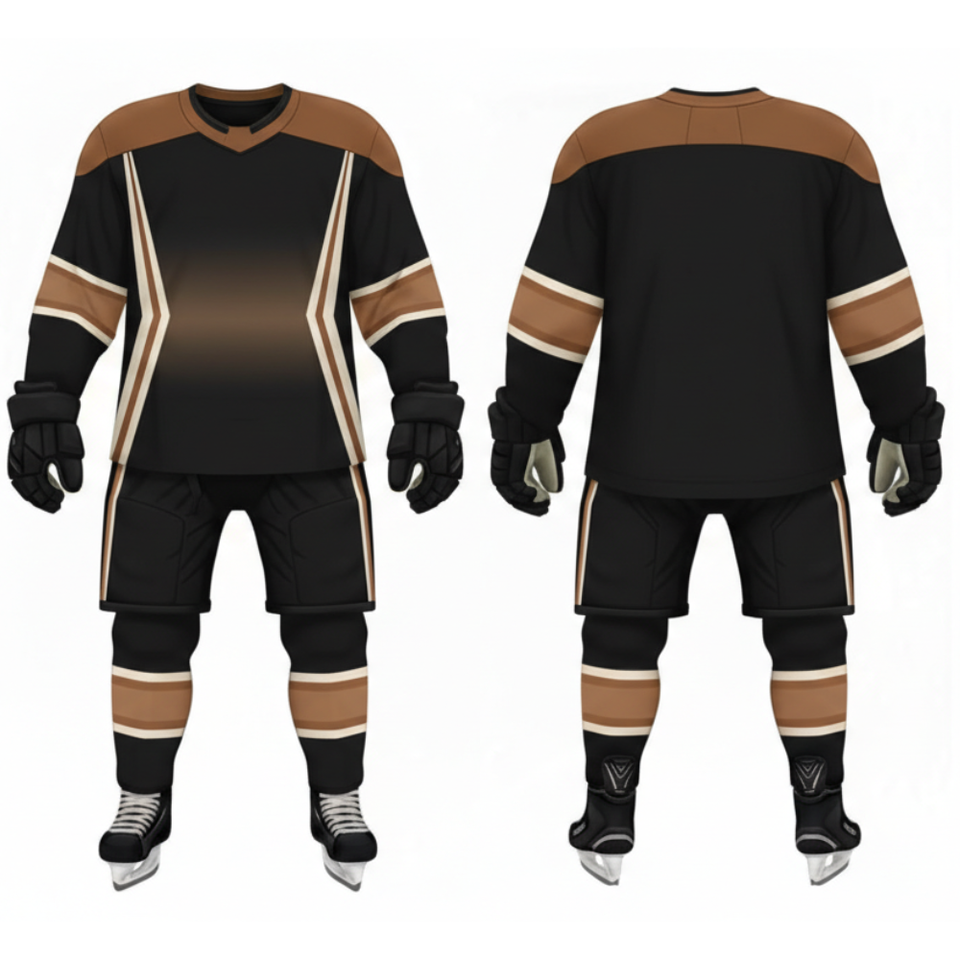 ชุดฮอกกี้น้ำแข็งสีดำและสีบรอนซ์ยอดนิยม - ออกแบบโลโก้ชุดกีฬาของคุณเอง เสื้อเจอร์ซีย์แบบมืออาชีพทรงวีพร้อมแผงตัดสี
