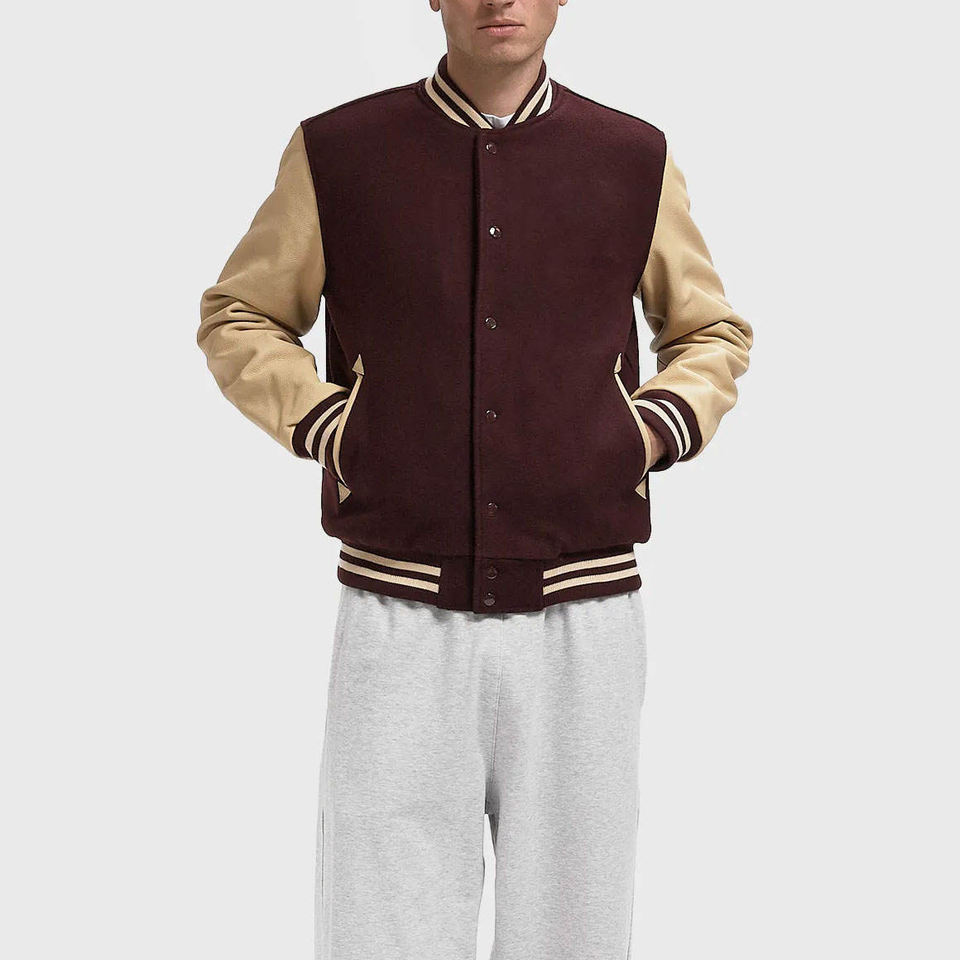 แจ็คเก็ตวาร์ซิตี้แบบกำหนดเองยอดนิยมสำหรับผู้ชาย ผ้าขนสัตว์ 100% แขนหนัง แจ็คเก็ตเลตเตอร์แมน ปักด้วยไหมเชนิลล์ แจ็คเก็ตสตรีทแวร์