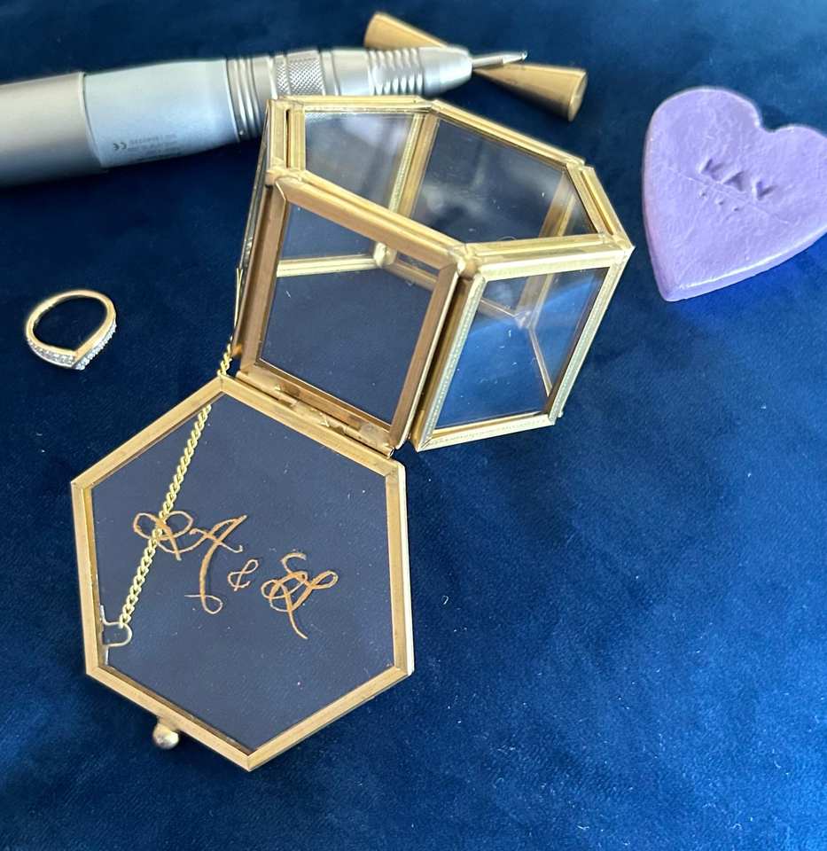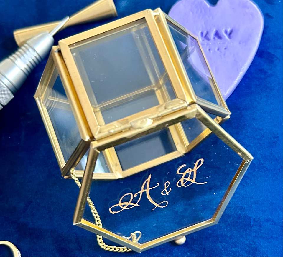 กล่องใส่แหวนแก้วดีไซน์ยอดนิยมอุปกรณ์จัดระเบียบเครื่องประดับทำจากแก้วและโลหะสีทองกรอบขัดมันสำหรับเป็นของขวัญแต่งงาน