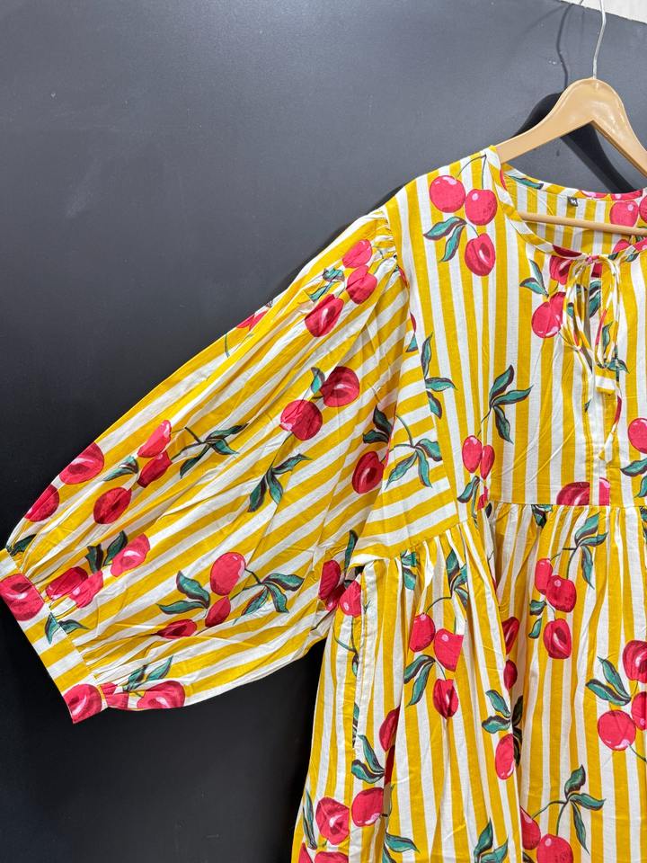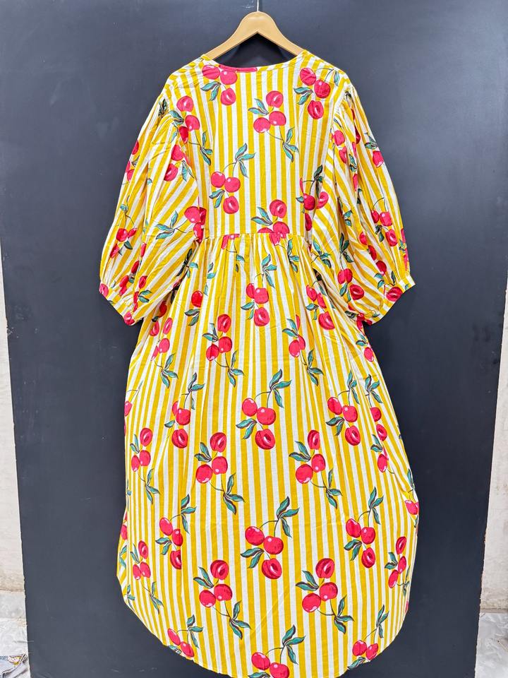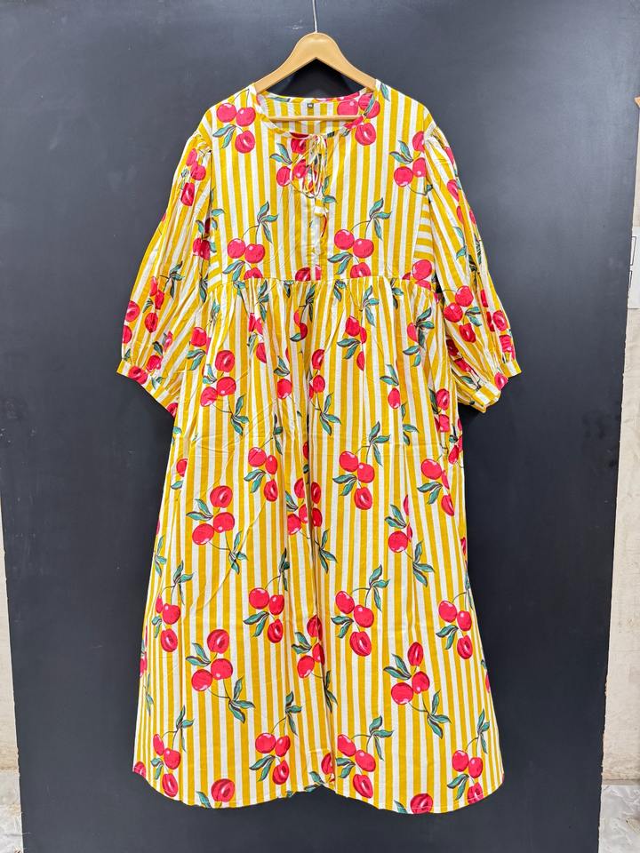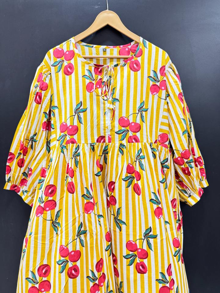 เดรสผ้าคอตตอนพิมพ์ลายดอกไม้ชุดมิดิแต่งพู่แบบลำลองมีรอบเอวธรรมชาติระบายอากาศถือง่ายสำหรับวันหยุดพักผ่อนชายหาดอินเดีย