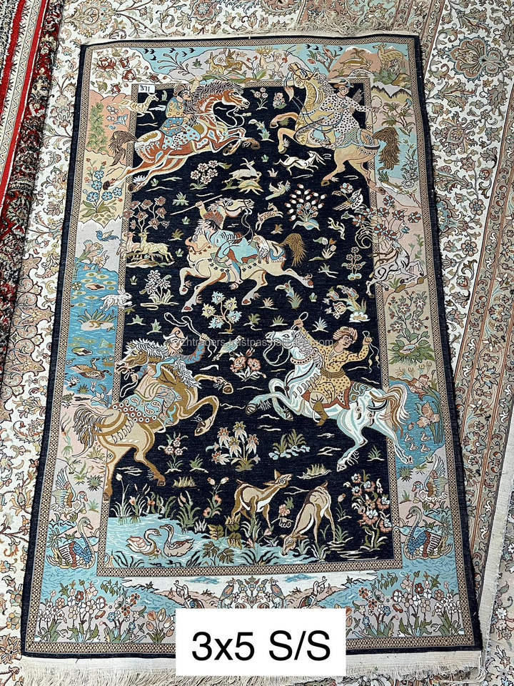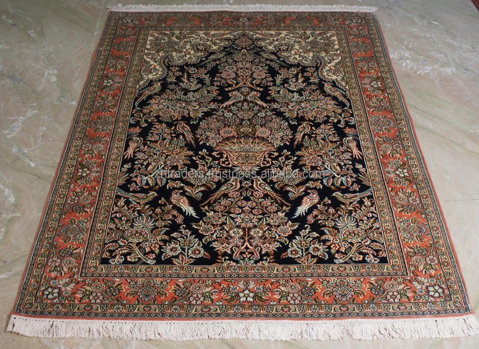 พรมเปอร์เซียผ้าไหมปักสีดำทำด้วยมือสำหรับห้องนั่งเล่นและห้องนอน