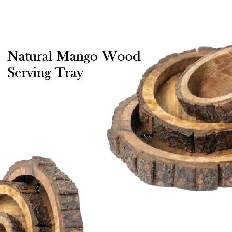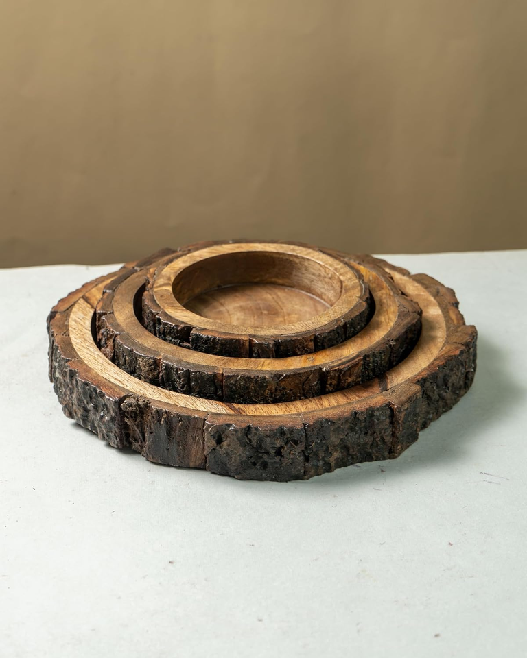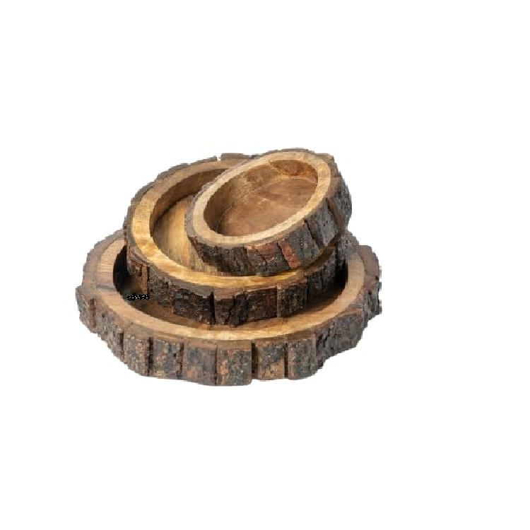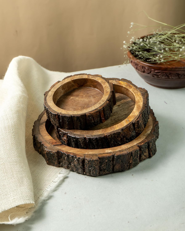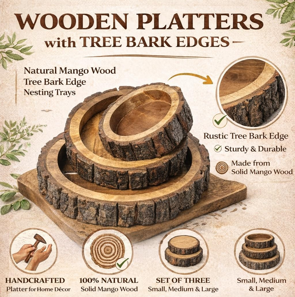 ชุดถาดไม้ทำมือ 3 ชิ้น ขอบลายเปลือกไม้ ถาดเสิร์ฟไม้มะม่วง สำหรับชา ขนม ของว่าง ใช้ในครัวและห้องรับประทานอาหาร