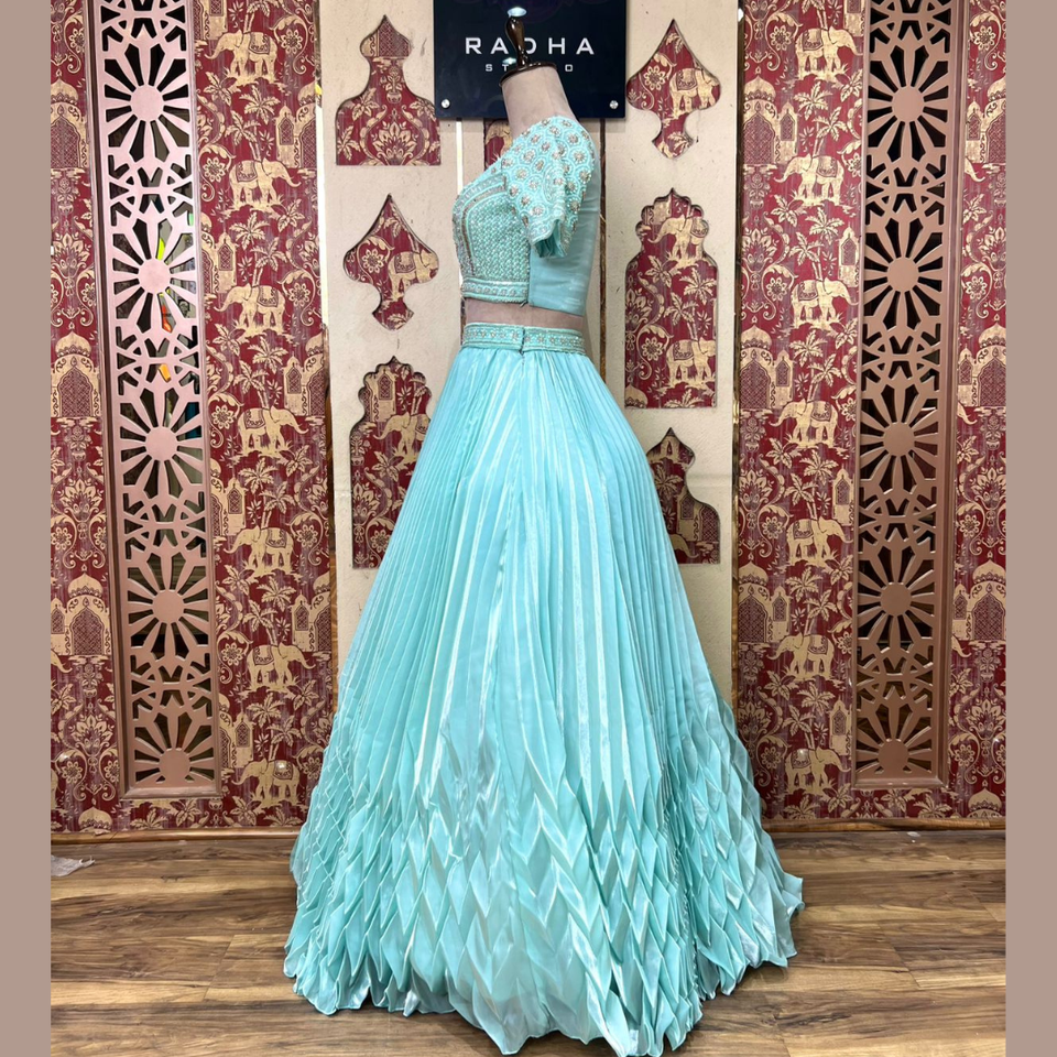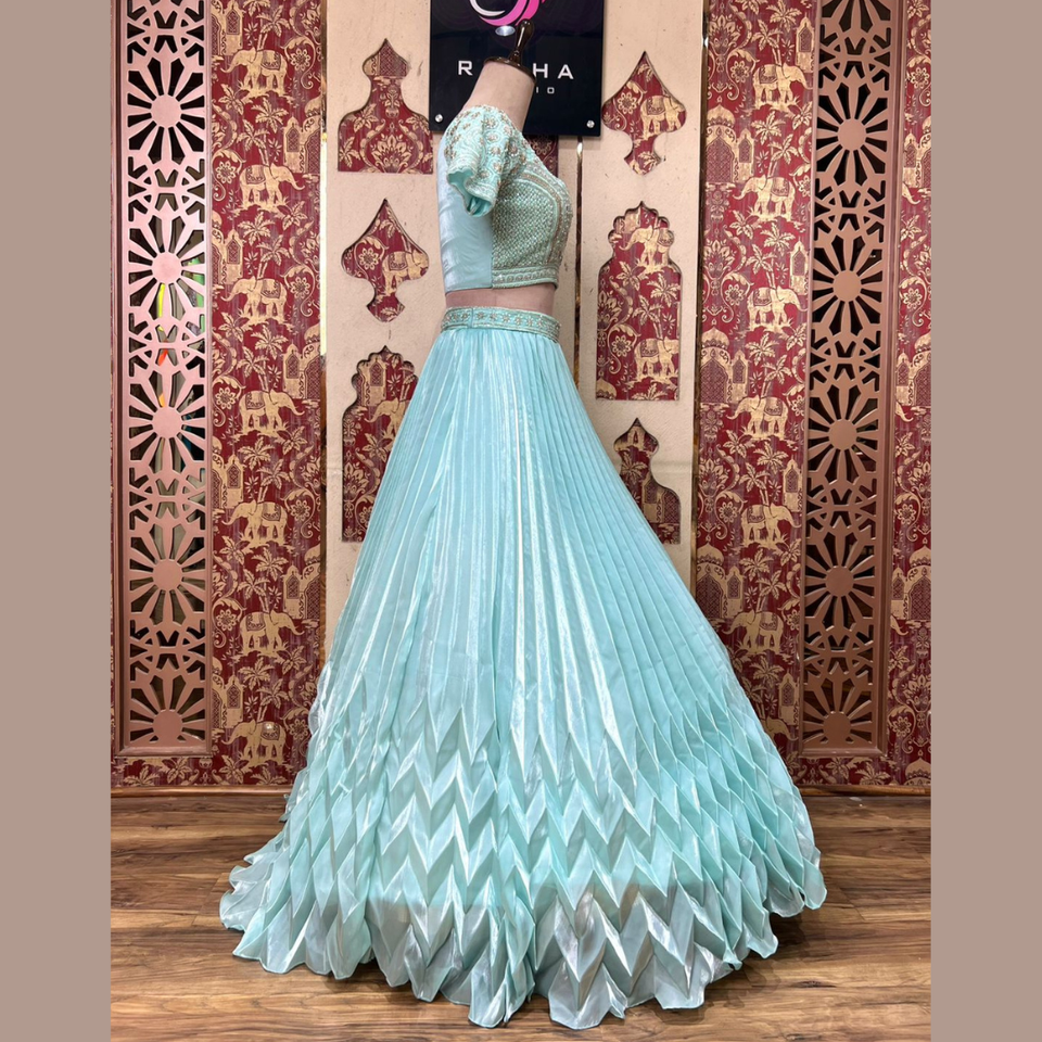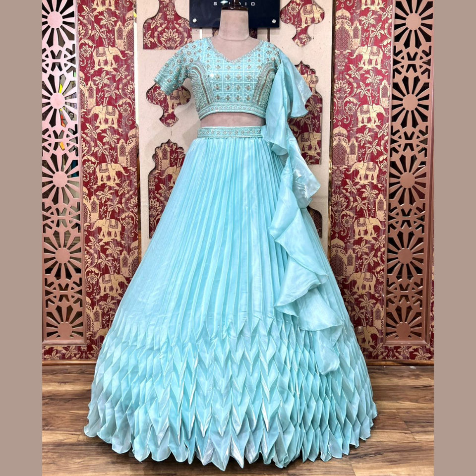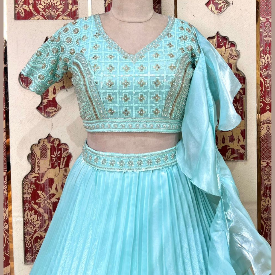 Lehenga สีฟ้าท้องฟ้าที่ขายดีที่สุดกับทุกจังหวะและลำดับชุดประจำชาติทำงานด้วยมือสำหรับงานแต่งงานและงานใหญ่จากอินเดีย