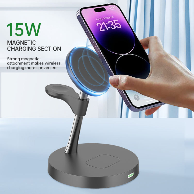 สินค้าขายดีที่สุด ที่ชาร์จไร้สาย 3 in 1 ที่ชาร์จโทรศัพท์มือถือ โลโก้สั่งทำได้ ชาร์จเร็ว 15W สำหรับ iPhone 16 15 พร้อมขาตั้งโทรศัพท์