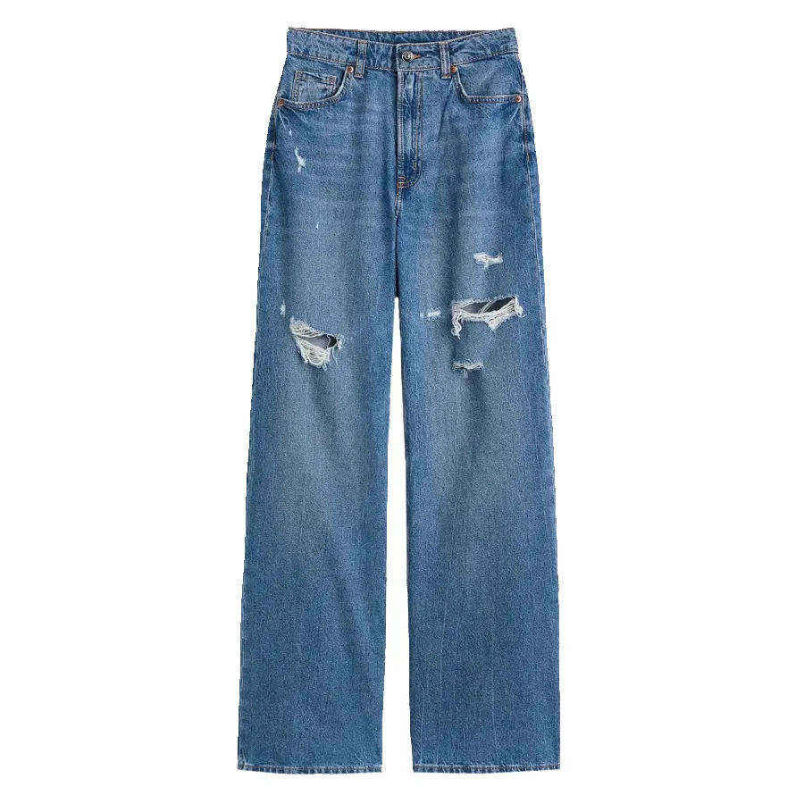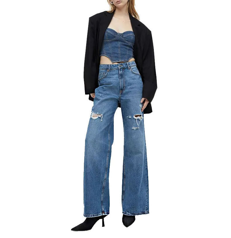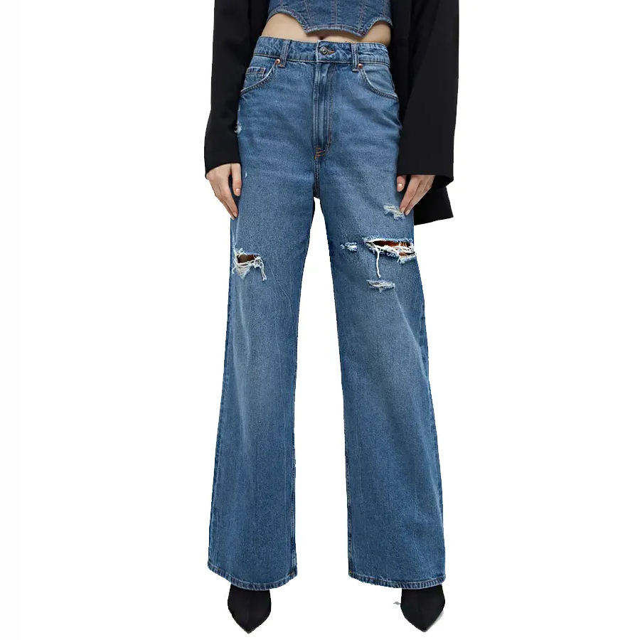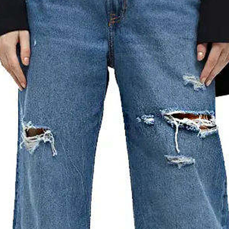 กางเกงยีนส์เดนิมทรงตรงสีน้ำเงินเข้มแบบขาดๆ ซักฟอก สไตล์ทันสมัยสั่งตัดได้สำหรับผู้หญิง เป็นมิตรต่อสิ่งแวดล้อม ระบายอากาศได้ดี แฟชั่นกางเกงขายาว