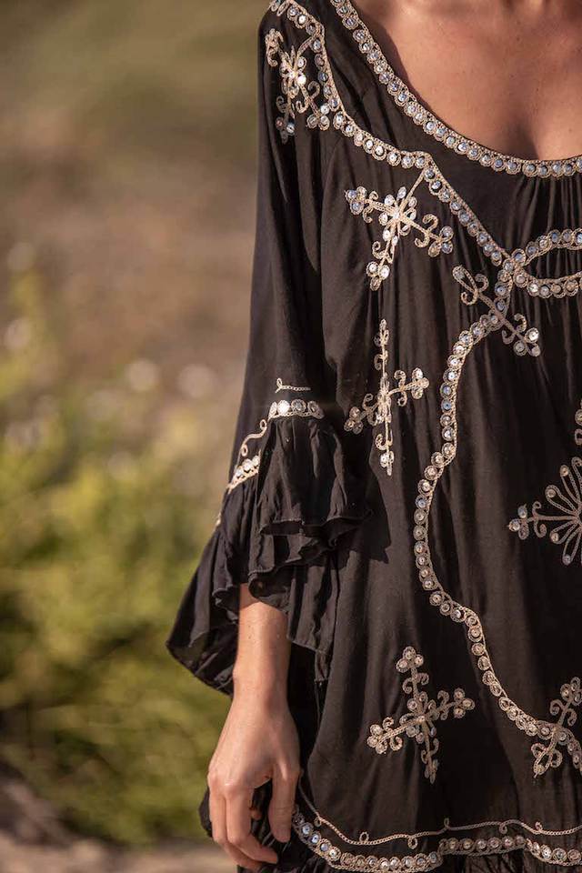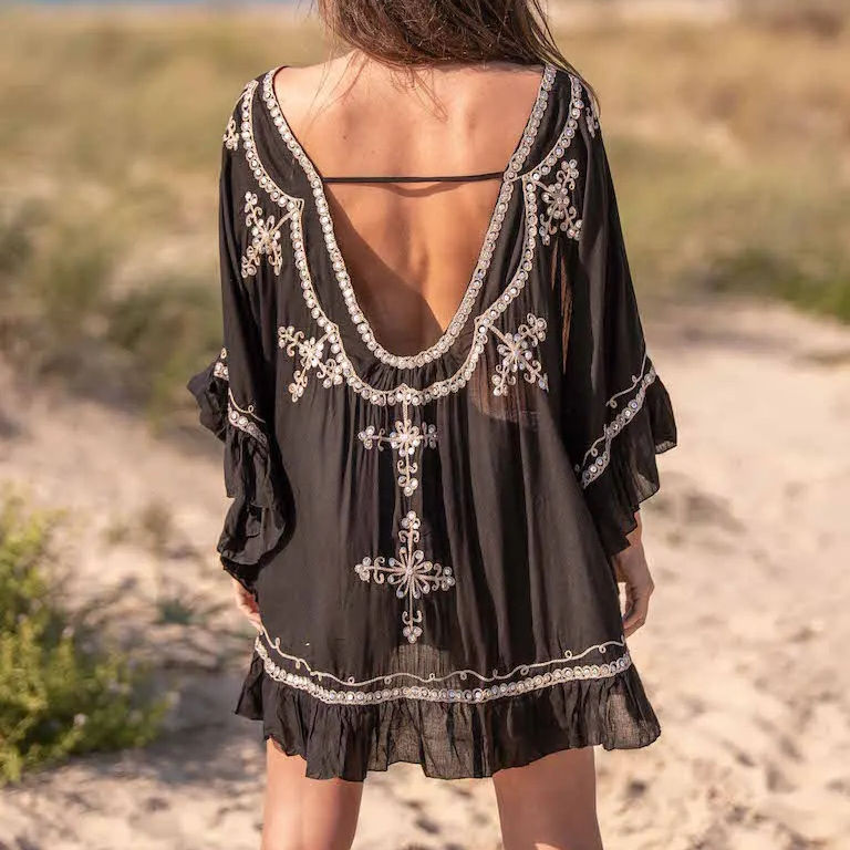 เสื้อว่ายน้ำชายหาดแขนยาวมีระบายสำหรับผู้หญิงเสื้อทูนิคปักลายโบฮีเมียน