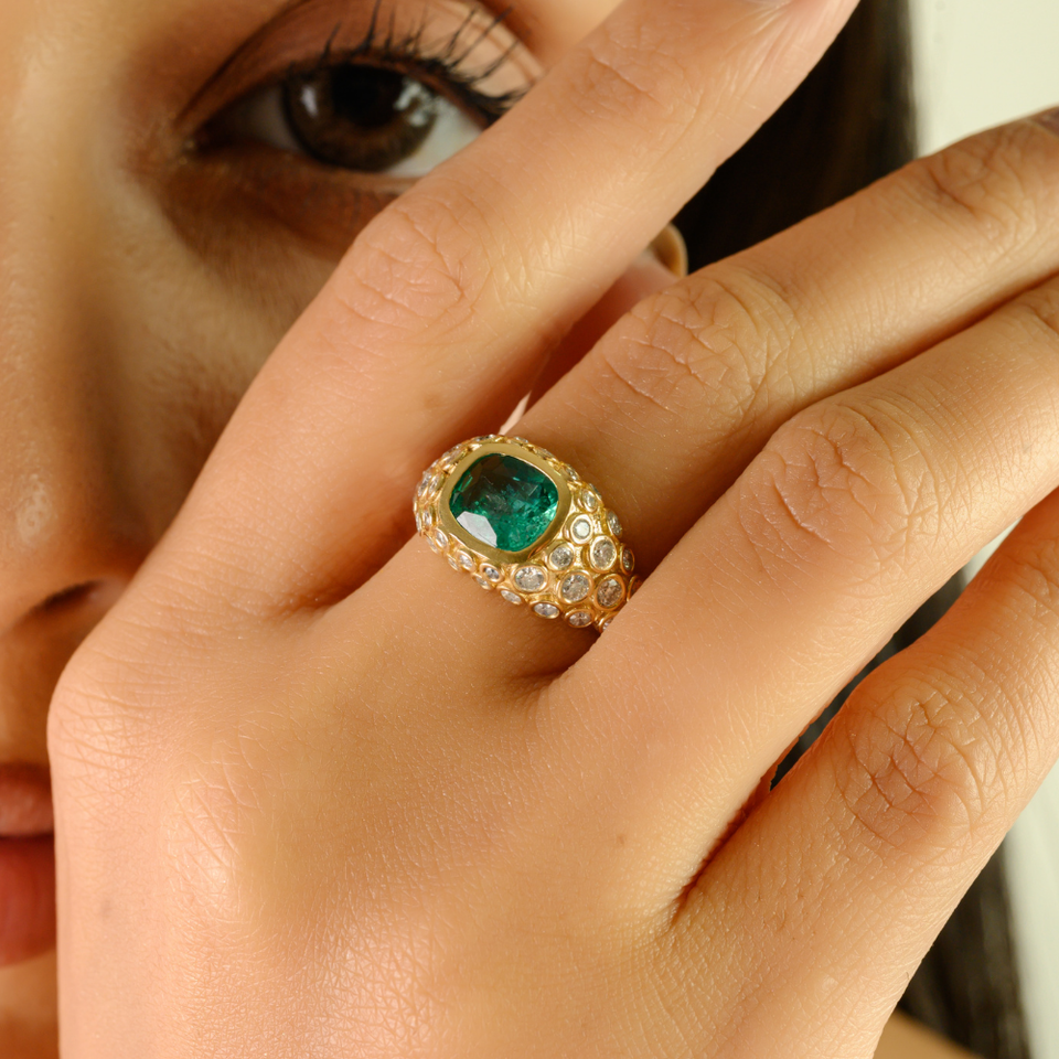 แหวนทรงโดมหนา ประดับมรกตและเพชร ดีไซน์สวยทันสมัย ทองคำ 18K สีเหลืองทอง เหมาะสำหรับงานปาร์ตี้