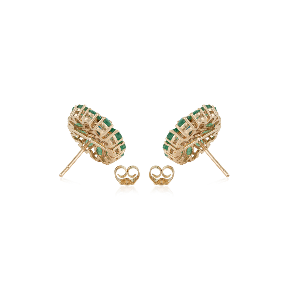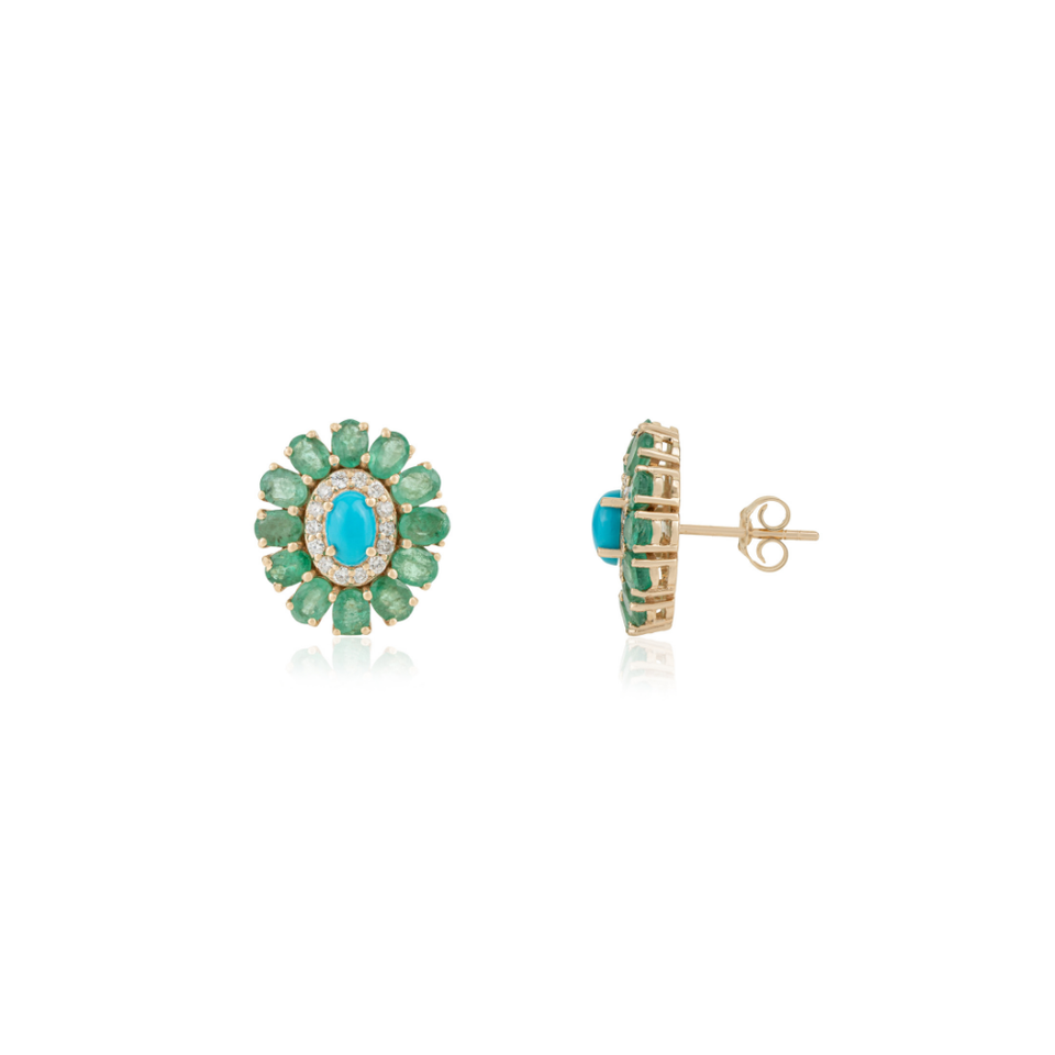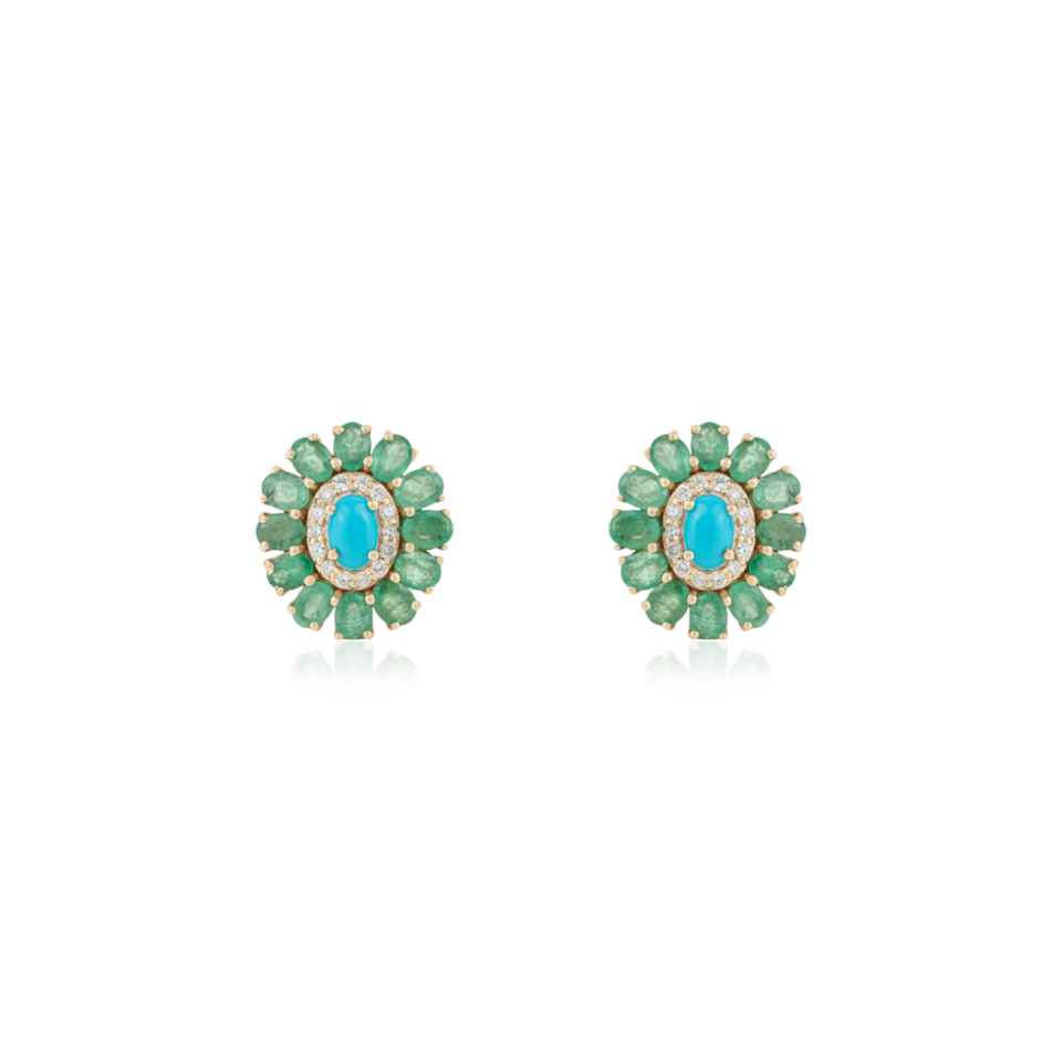 ต่างหูแบบติดหูทรงดอกไม้ประดับมรกต เทอร์ควอยซ์ และเพชร ดีไซน์โดดเด่น วัสดุทองคำแท้ 14K สีเหลืองทอง สินค้าขายดี
