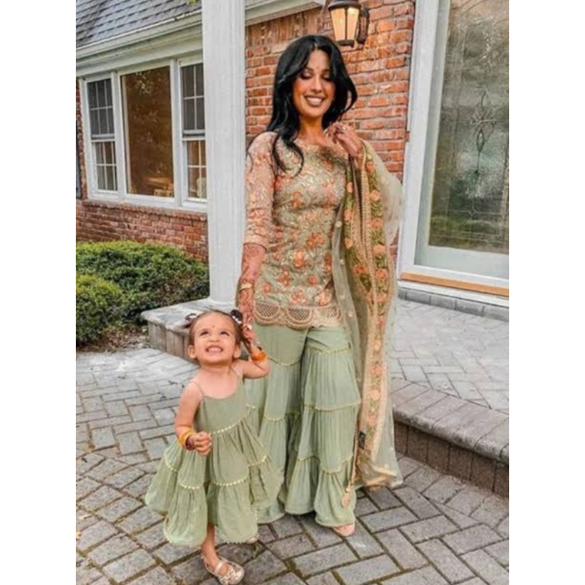 ชุดชาราร่าแม่ลูกแบบเข้าชุดกัน – เสื้อคุर्ติปักลายสีเขียวเซจพร้อมผ้าคลุมไหล่
