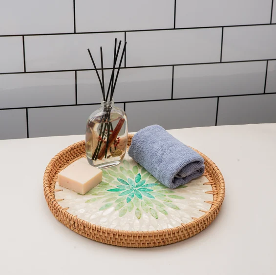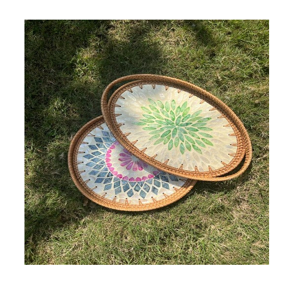 ถาดเสิร์ฟมุกคุณภาพสูง พร้อมถาดเก็บของมุกคุณภาพสูง งานฝีมือลายดอกไม้ทรงกลม
