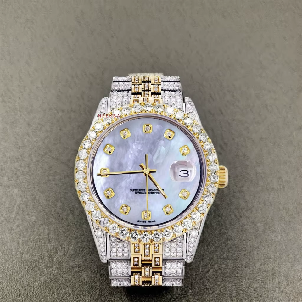 นาฬิกาเพชรหน้าปัดมุกพร้อมสายสแตนเลสสองสี นาฬิกาโมอิสซาไนต์ทำมือสุดหรูจากผู้ขายชาวอินเดีย