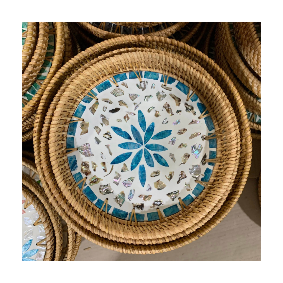 ถาดหวายฝังมุกพร้อมหูจับ ประดับเปลือกหอยสีรุ้ง ถาดเสิร์ฟตกแต่งหรูหรา สำหรับใช้บนโต๊ะอาหารและตกแต่งบ้าน