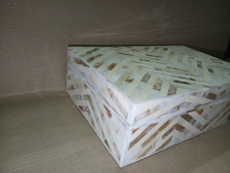 Mother of Pearl Inlay Rectangle Jewelry Box with Zig Zag Pattern Vanity Desk Decorative Display Storage Accessories