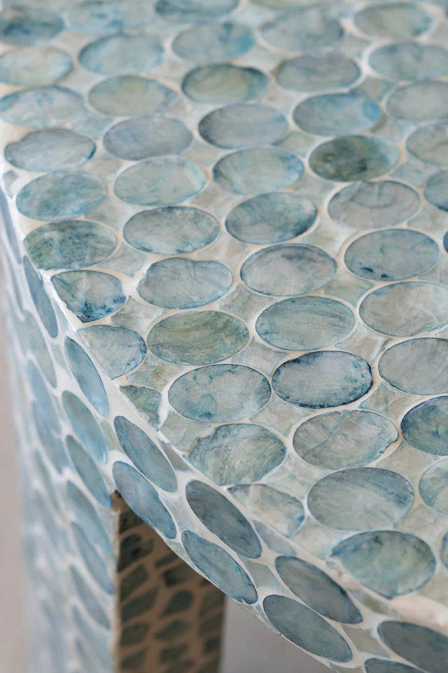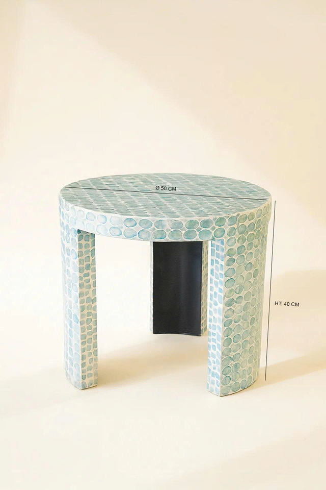 โต๊ะข้างกลมฝังมุกแม่ลูกทำด้วยมือเน้นโต๊ะด้วยกระเบื้องโมเสคสีฟ้าสำหรับห้องนั่งเล่นห้องนอนหรือตกแต่งชายฝั่ง
