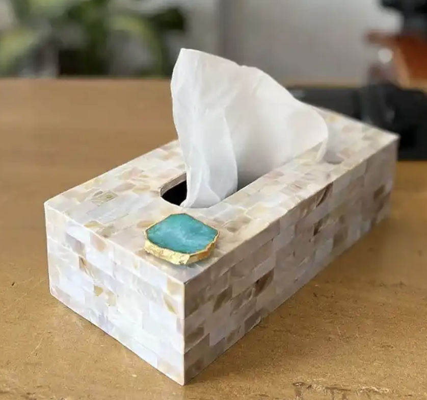 กล่องกระดาษทิชชู่แม่ของไข่มุกสำหรับตกแต่งโต๊ะกล่องกระดาษม็อบสีเขียวจริง