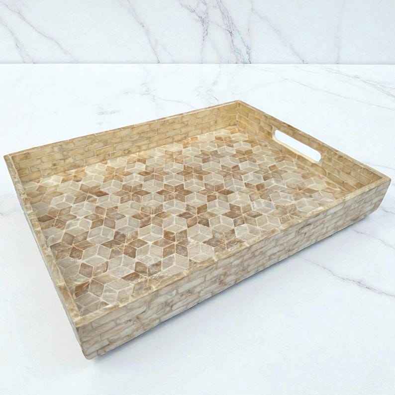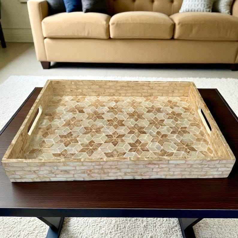 ถาดเสิร์ฟเปลือกหอยมุกเคลือบแลคเกอร์ ถาดไม้ตกแต่งฝังมุก ถาดออตโตมันมีหูจับ