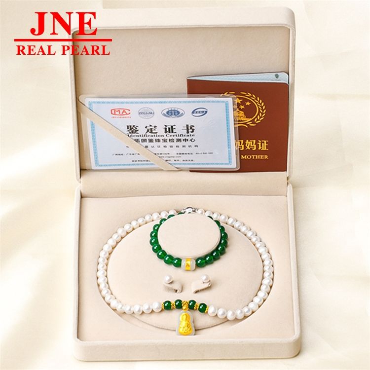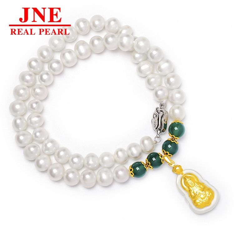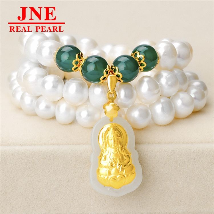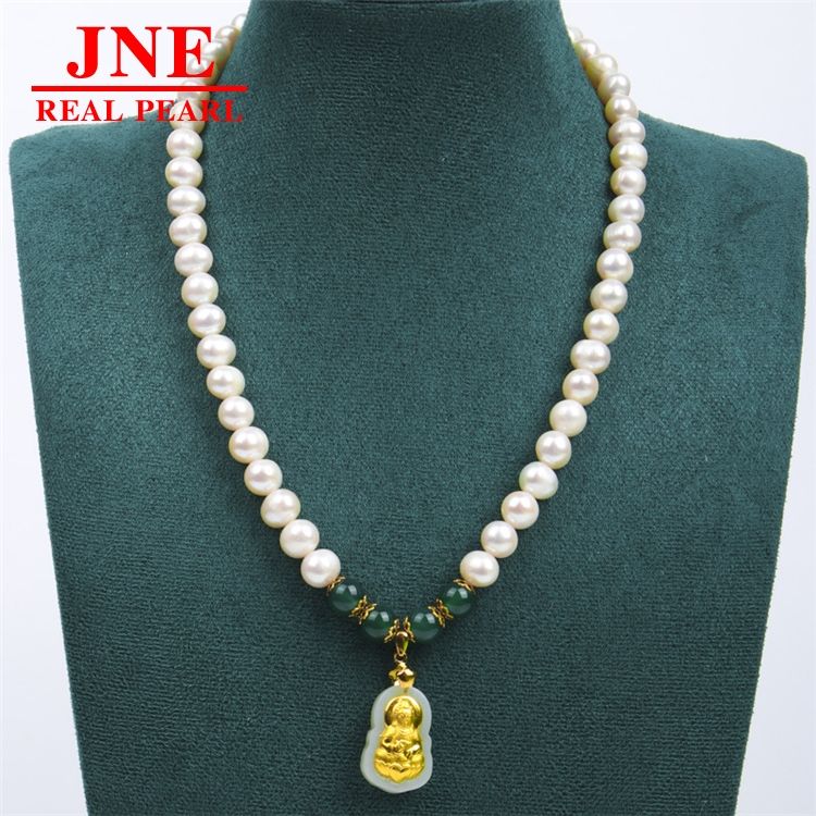 ของขวัญวันแม่ สร้อยคอมุกน้ำจืดธรรมชาติ 8-9 เม็ด ประดับทองคำ พร้อมหยกกวนอิมเล็กๆ สร้อยคอหยกสำหรับมอบให้คุณแม่