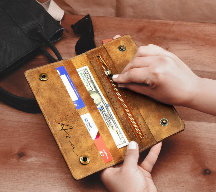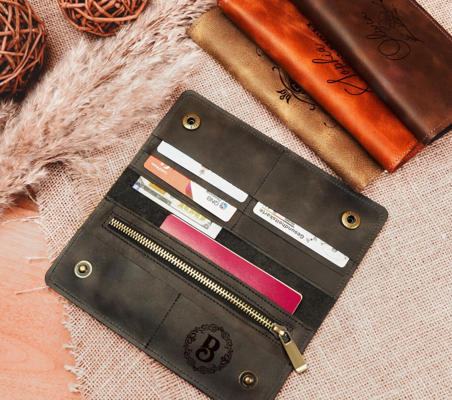 ของขวัญวันแม่ กระเป๋าสตางค์หนังผู้หญิงแบบสั่งทำพิเศษ ของขวัญวันเกิดแม่ กระเป๋าสตางค์ปักชื่อย่อแบบกำหนดเอง ที่ใส่บัตรหนัง