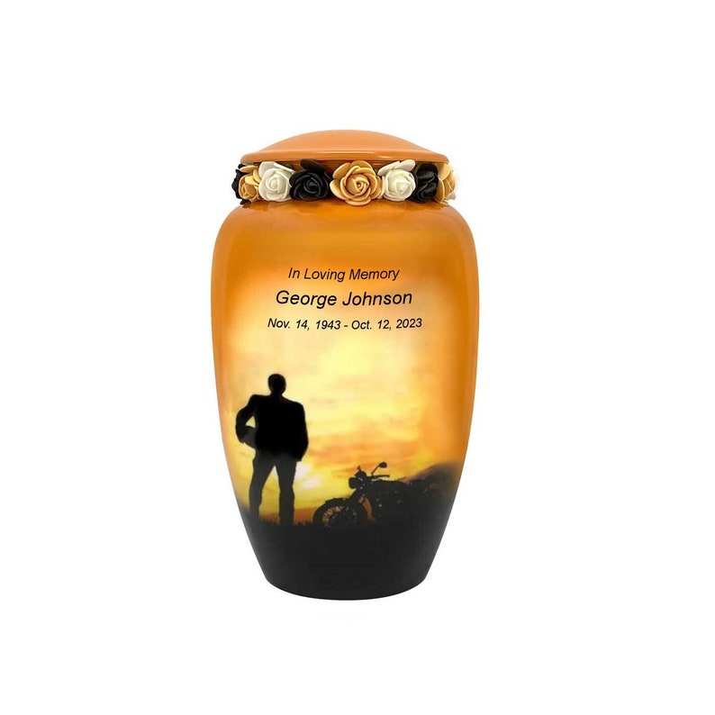 โกศบรรจุอัฐิสำหรับมอเตอร์ไซค์ รูปแบบทันสมัย เป็นมิตรกับสิ่งแวดล้อม ทำด้วยมือจากโลหะ สำหรับนักขี่มอเตอร์ไซค์ พร้อมบริการสลักชื่อตามสั่ง และเลือกสีได้