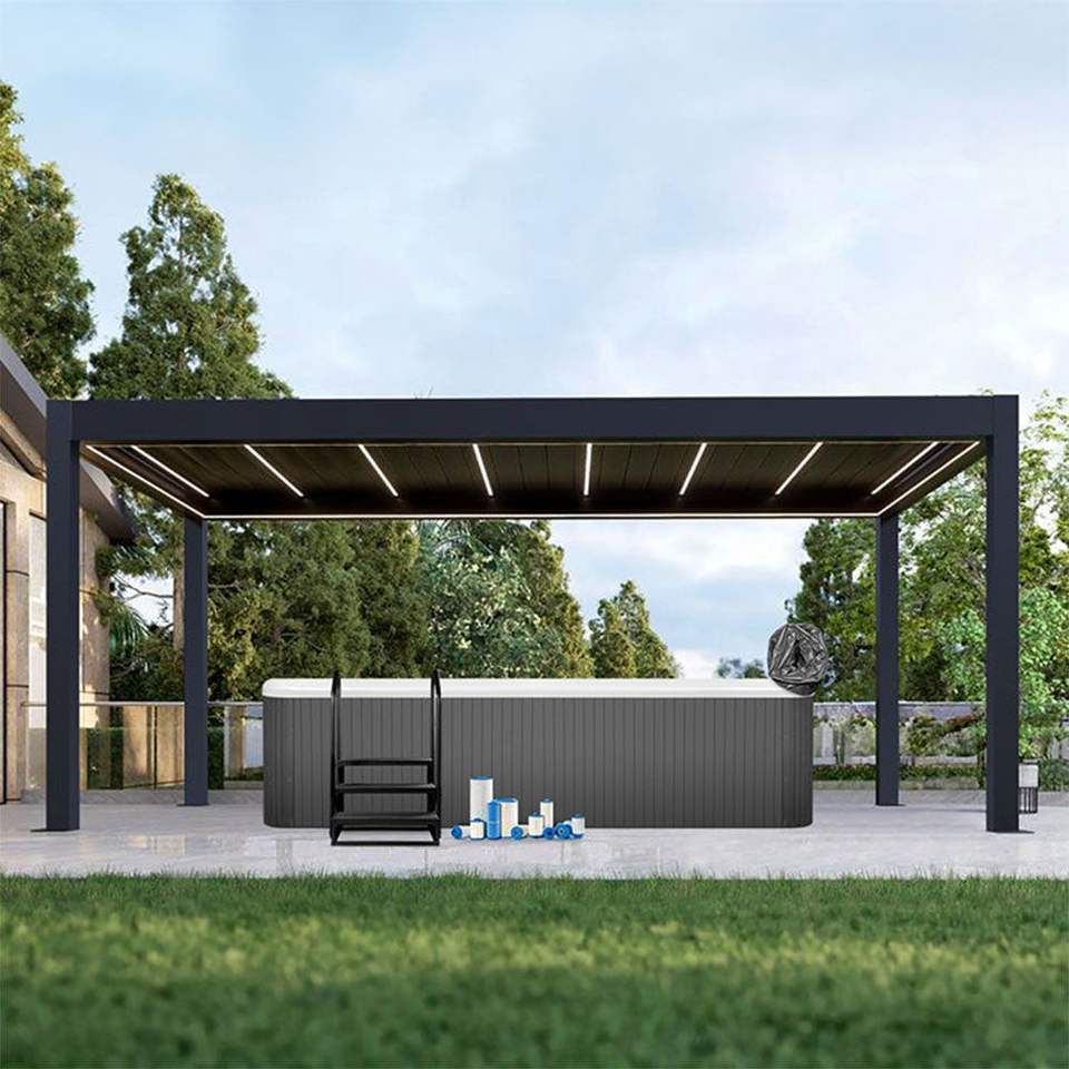 หลังคาเพอร์โกลาอลูมิเนียมปรับได้ด้วยมอเตอร์เคลือบสีฝุ่นกันน้ำสำหรับระเบียงกลางแจ้งพร้อมรีโมทคอนโทรล หลังคาแบบปรับได้พร้อมไฟ LED สำหรับลานบ้าน