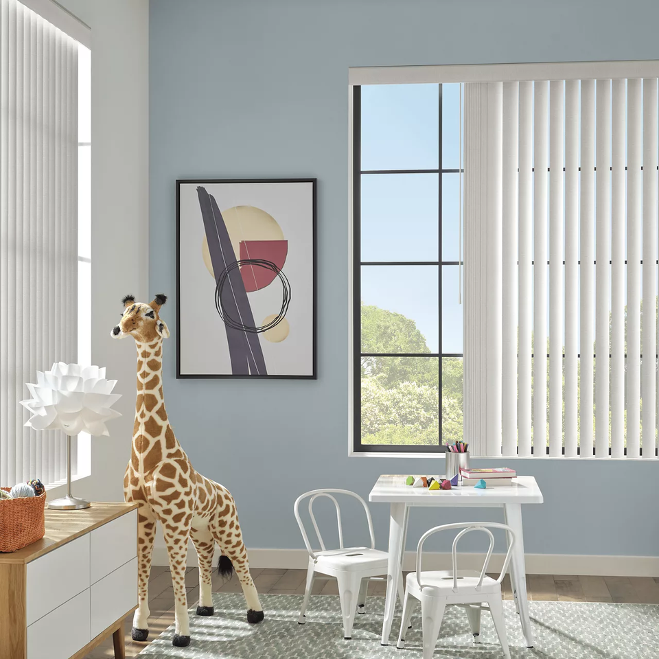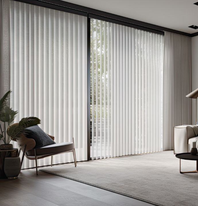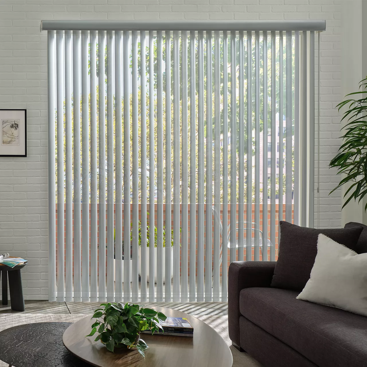 มู่ลี่แนวตั้งพลาสติกในตัวพิมพ์ลายแบบใช้มอเตอร์พร้อมบานเกล็ดสำหรับกั้นหน้าต่างห้องฝรั่งเศส