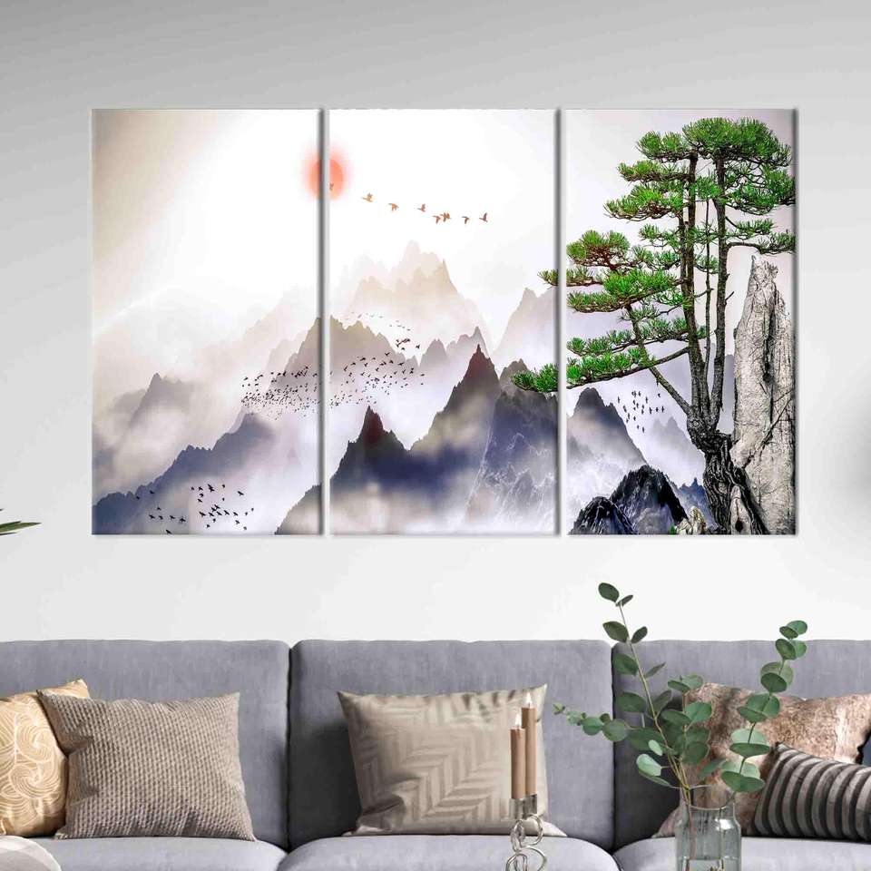 ภาพพิมพ์บนผ้าใบลายวิวภูเขา: ศิลปะตกแต่งผนังลายวิวทิวทัศน์ญี่ปุ่นสไตล์โบฮีเมียน,3P: ห่อหุ้มอย่างดี