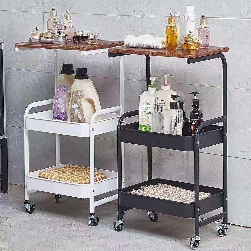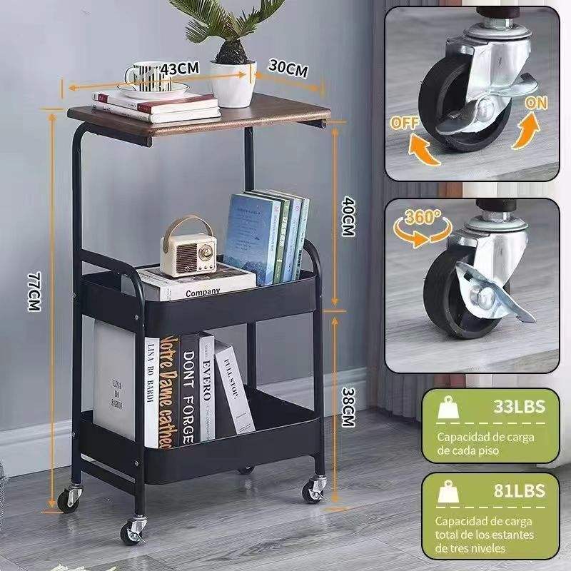 ชั้นวางของเคลื่อนที่ 3 ชั้น ท็อปไม้ รถเข็นอเนกประสงค์แบบพกพา สำหรับห้องนั่งเล่น ห้องนอน โต๊ะกาแฟ โต๊ะข้าง