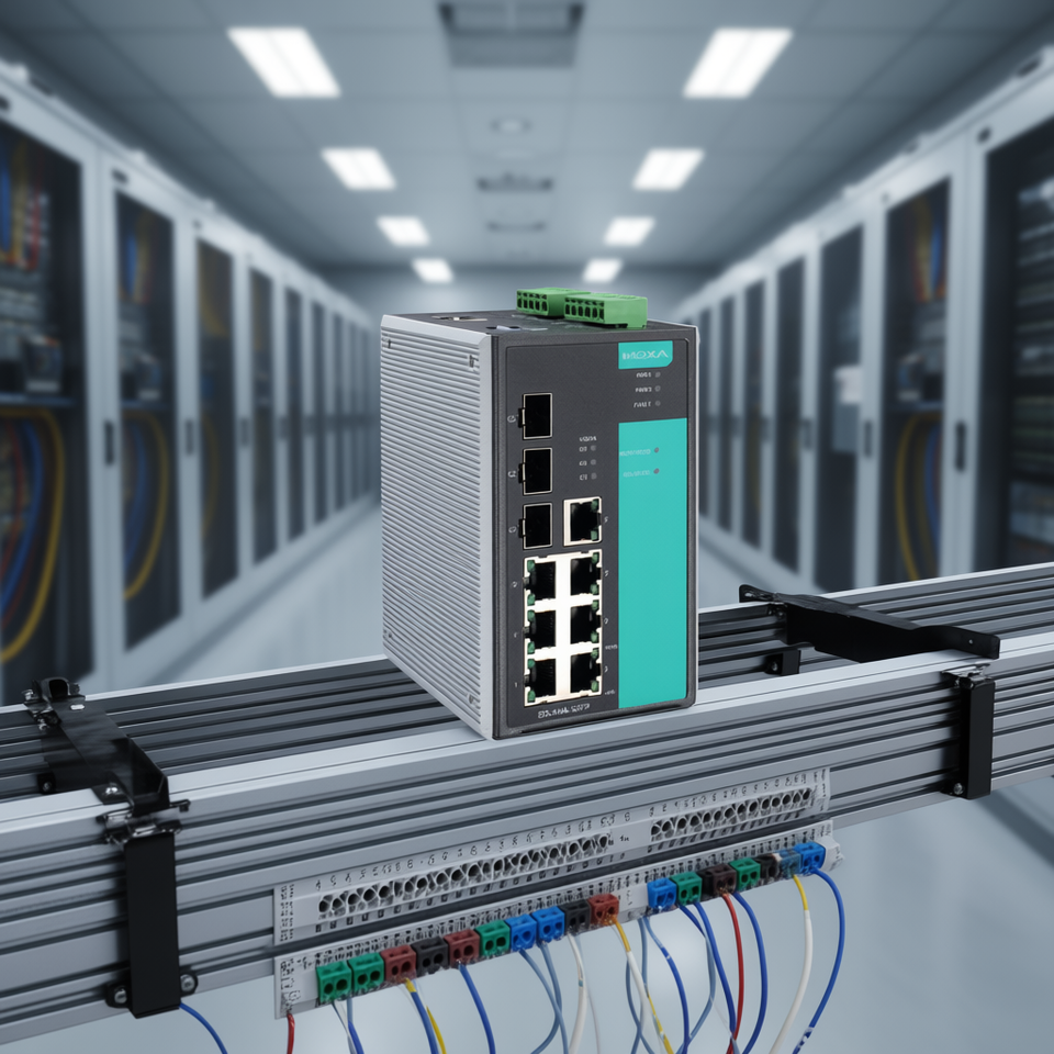 Moxa EDS-510A-3SFP-T สวิตช์อีเธอร์เน็ตอุตสาหกรรมแบบติดตั้งบนราง DIN 8 พอร์ต กิกะบิต พร้อมระบบจัดการระดับองค์กร รองรับไฟ 24V และหัวต่อ SC/UPC