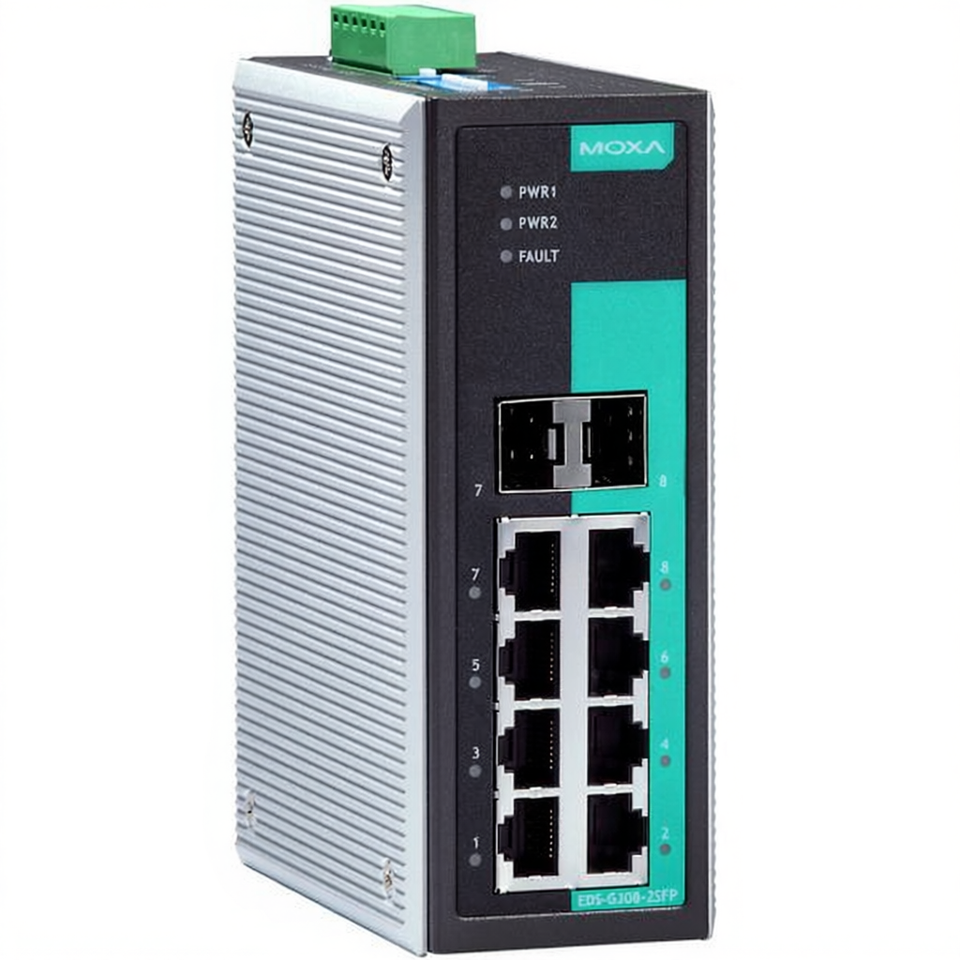 Moxa EDS-G308-2SFP กิกะบิต อุปกรณ์สวิตช์อีเธอร์เน็ตแบบไม่ต้องจัดการ 8 พอร์ต สำหรับเครือข่ายอุตสาหกรรม