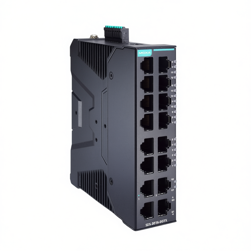 สวิตช์จัดการ Moxa SDS-3016-2GTX-T 16 พอร์ต กิกะบิตอีเธอร์เน็ต 24V IEEE 802.3 สำหรับติดตั้งบนราง DIN สำหรับอุตสาหกรรมและองค์กร