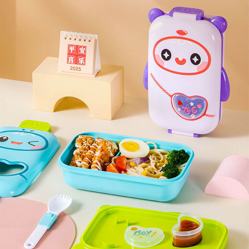 กล่องข้าวเด็กทรงสี่เหลี่ยมผืนผ้า ยี่ห้อ Mr. Gulu ฝาพลาสติก ลายการ์ตูน พร้อมช้อนส้อมและช่องใส่ซอส สำหรับเด็กใช้ในโรงเรียน