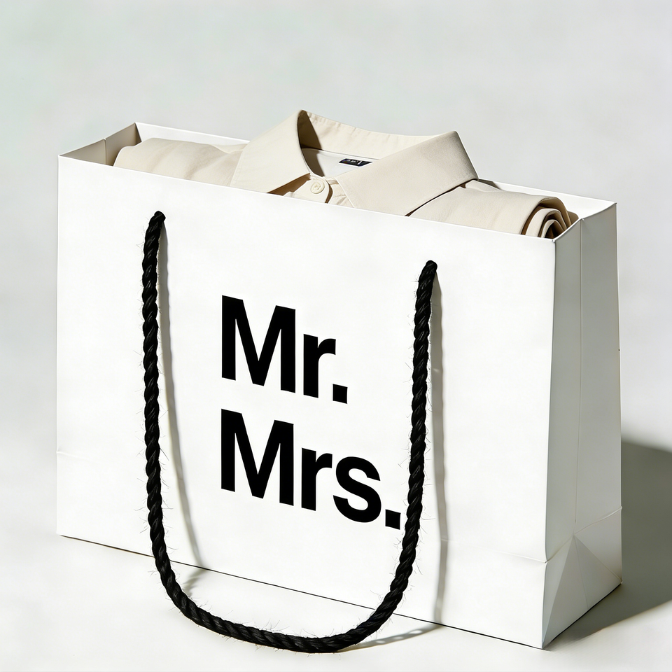 ถุงกระดาษใส่เสื้อผ้าคุณและคุณผู้หญิง สีขาว สำหรับบรรจุภัณฑ์ของขวัญสุดหรู ถุงกระดาษนำกลับมาใช้ใหม่ได้ พิมพ์ลาย พร้อมหูหิ้วเชือกป่าน สำหรับธุรกิจ