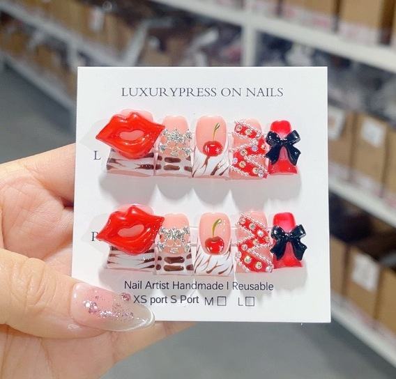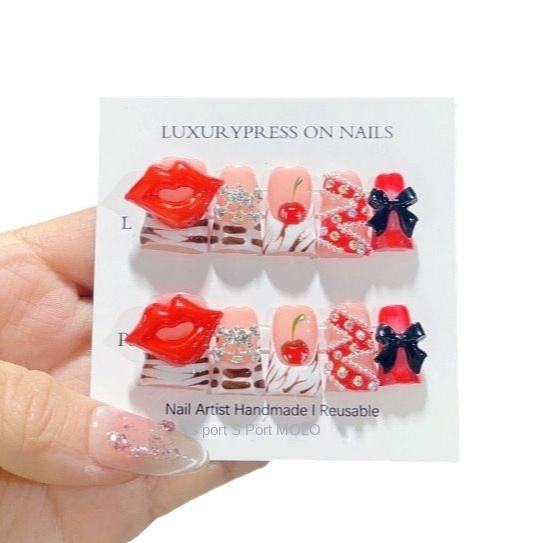 Ms.miemie 10ชิ้นเล็บแบบกดทำมือคุณภาพสูงแบบแฮนด์เมดแผ่นปะรูปหมีสีแดงเข้มสำหรับการใช้นิ้วแบบขายส่ง
