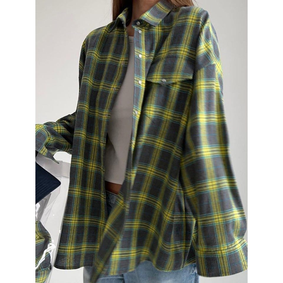 เสื้อเชิ้ตลายสก็อตโอเวอร์ไซส์สำหรับผู้หญิง ฤดูใบไม้ร่วง-ฤดูหนาว ปี 2023 สไตล์วินเทจ แขนยาว ทรงหลวม สีชมพู ไซส์ L