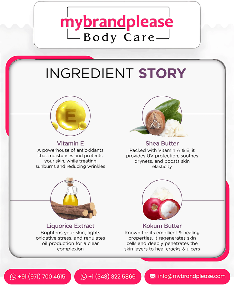 วิตามินอี, น้ำมันโจโจบา, เชียบัตเตอร์, Kokum Butter, Sesame Oil, Papaya Extract, Licorice Extract, Grapefruit Extract, Saccharide Isomerate, Glycerine, Allantoin