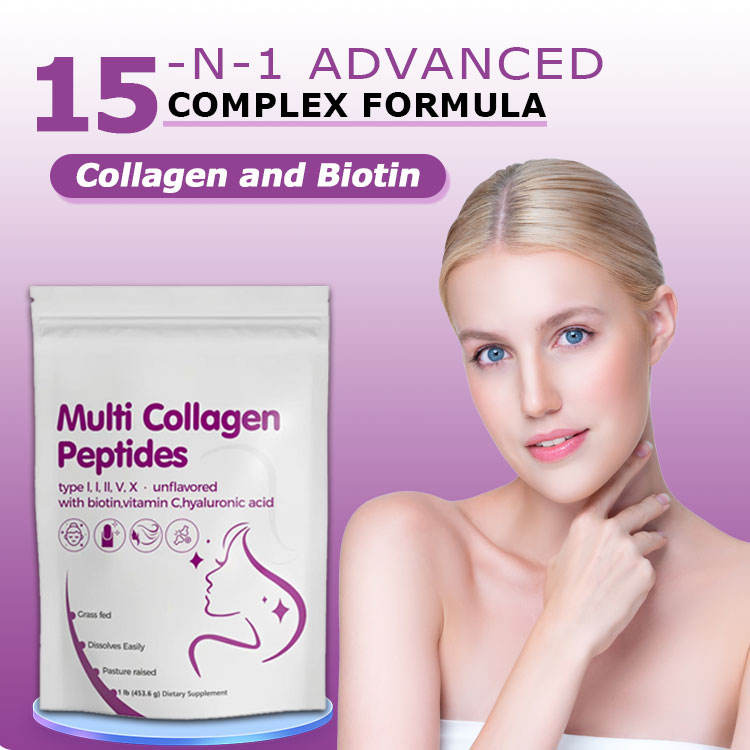 ผงคอลลาเจนเปปไทด์หลายชนิด ผสมไบโอตินและกรดไฮยาลูโรนิก คอลลาเจนโปรตีนไฮโดรไลซ์ บำรุงเส้นผม ผิว เล็บ และข้อต่อ