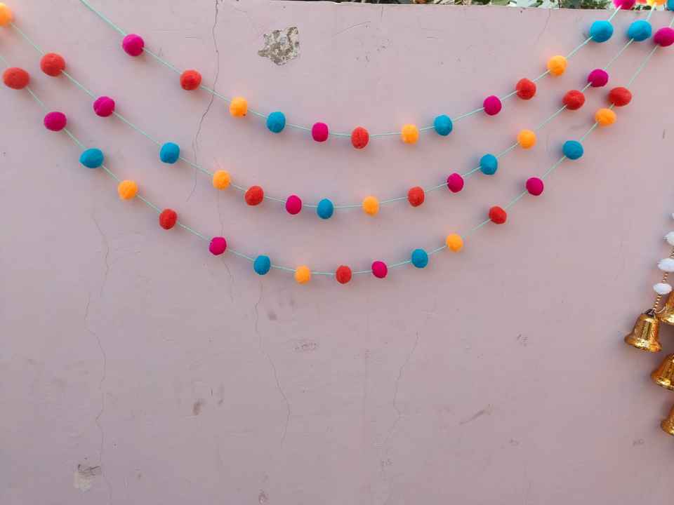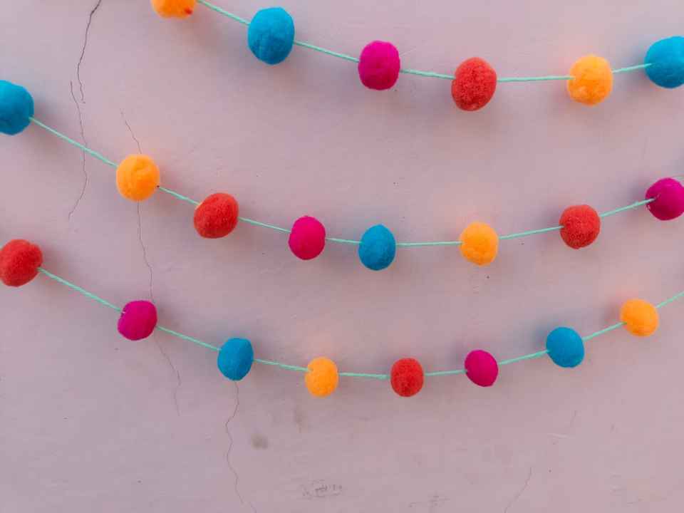 หลายสีสักหลาดปอมปอมสตริงการรวมตัวกันทางเทศกาลสําหรับปาร์ตี้คริสต์มาสฮอลลีและประเพณีอินเดียยินดีกับวันหยุดเชียร์ในทุกเส้น