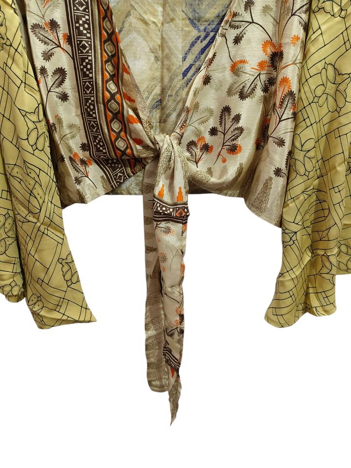 เสื้อเกาะอกผ้าไหมหลากสีพิมพ์ลายดอกไม้, เสื้อครอปแขนกระดิ่งทรงหลวมดีไซน์แบบเย็บปะติด