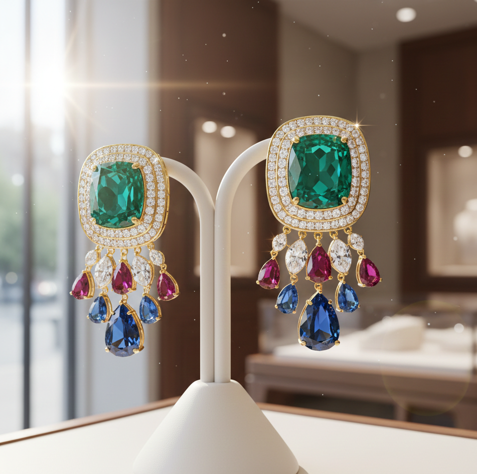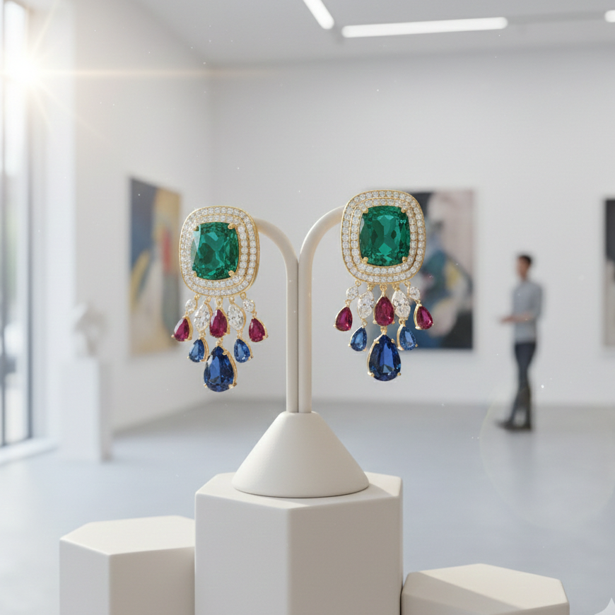 ต่างหูห้อยประดับพลอยหลากสี เขียว แดง และน้ำเงิน ไฮโดร พร้อมคิวบิกเซอร์โคเนีย เงินแท้ 925 ชุบทอง 18K