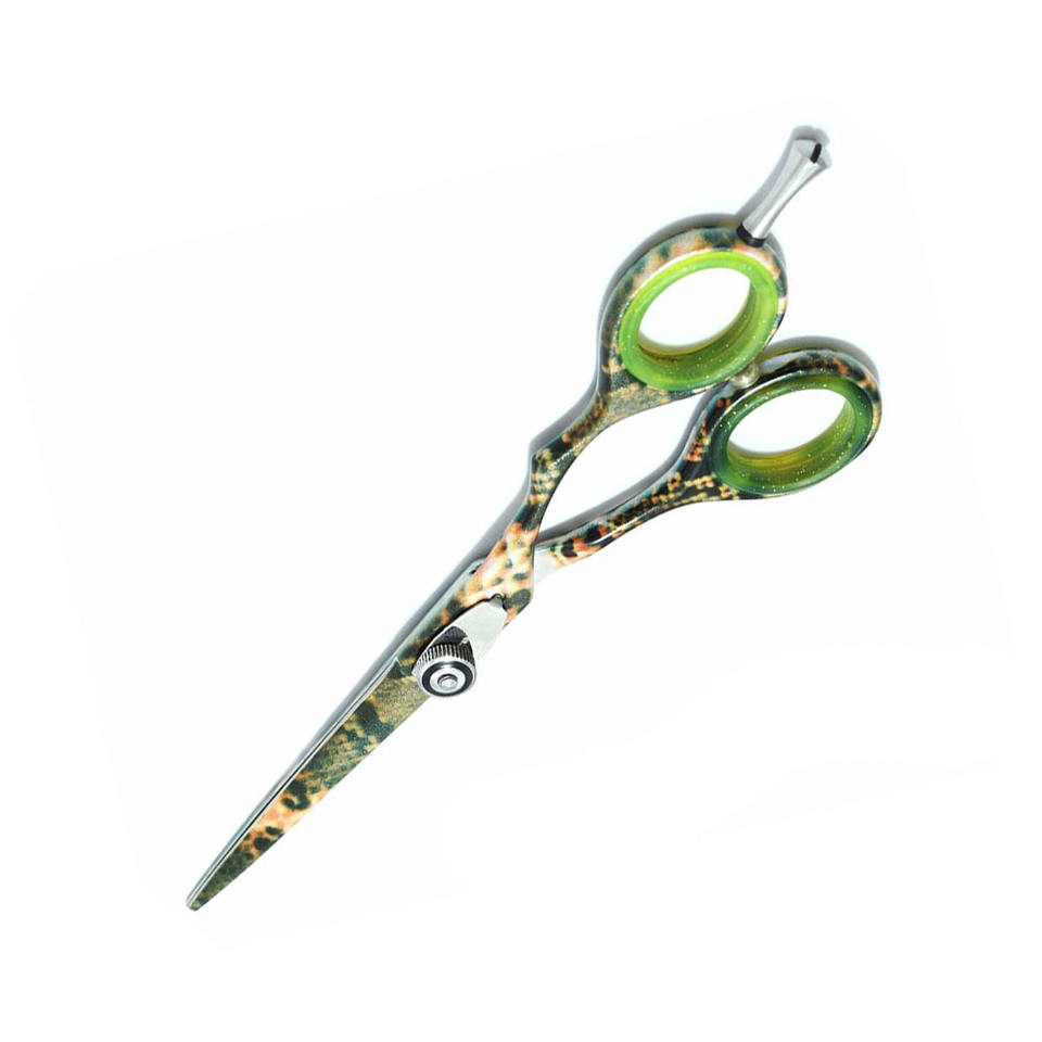 กรรไกรช่างตัดผมกระดาษเคลือบหลายสีพร้อมที่วางนิ้วปรับได้และแหวนยางสีเขียว