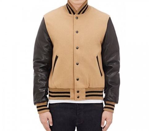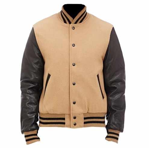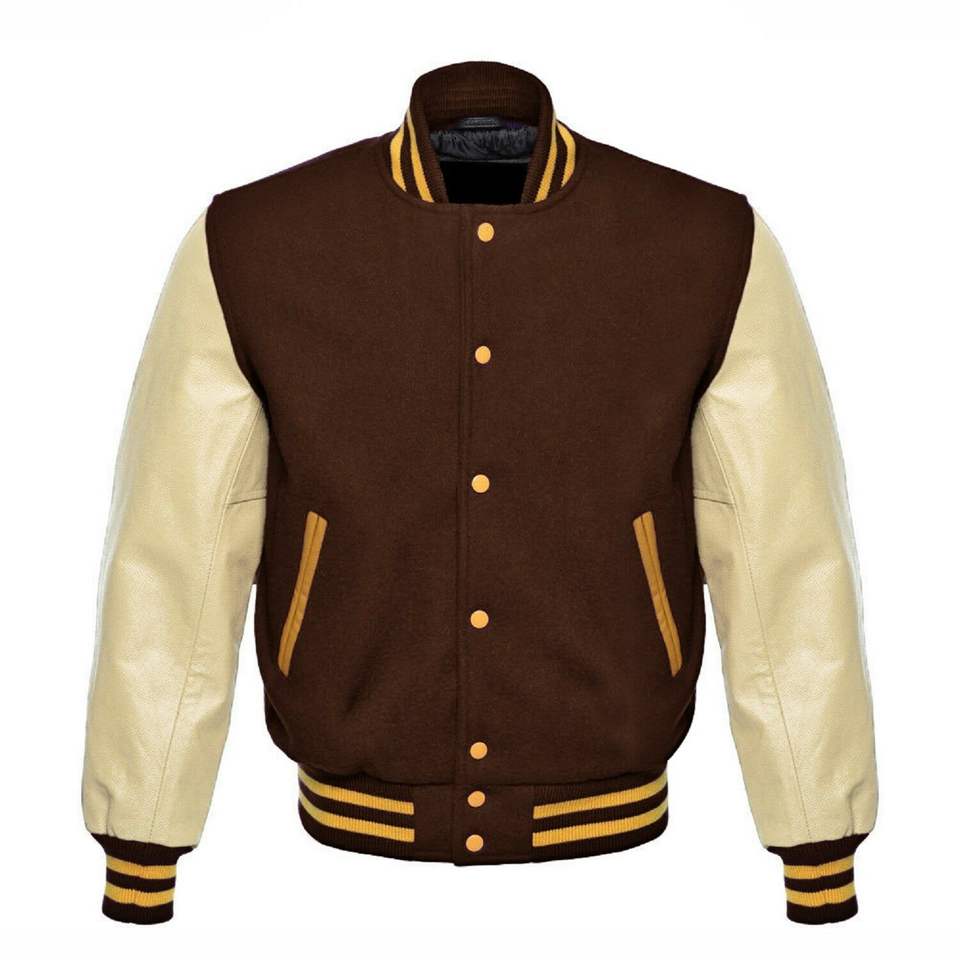 แจ็คเก็ตเบสบอลแบบวาร์ซิตี้หลากแบบขายส่ง สีน้ำตาล แจ็คเก็ตบอมเบอร์แบบวาร์ซิตี้สั่งทำพิเศษ ตัวเสื้อทำจากผ้าขนสัตว์ แขนเสื้อทำจากหนัง