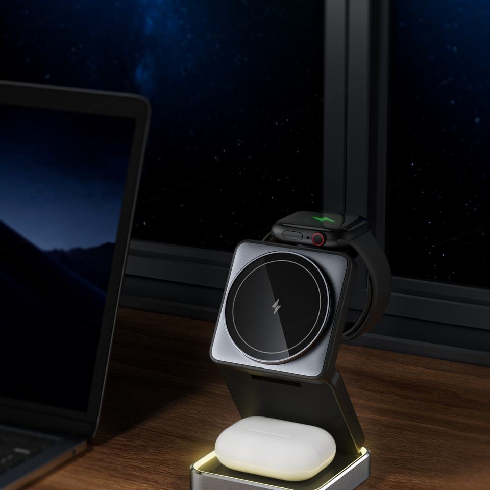 แท่นชาร์จไร้สายอเนกประสงค์ 3-in-1 รุ่น E-L90 15W สำหรับเทคโนโลยีชั้นนำ ผลิตจากอะลูมิเนียมอัลลอยด์ รองรับการชาร์จแบบแม่เหล็ก สำหรับโทรศัพท์มือถือและสมาร์ทวอทช์