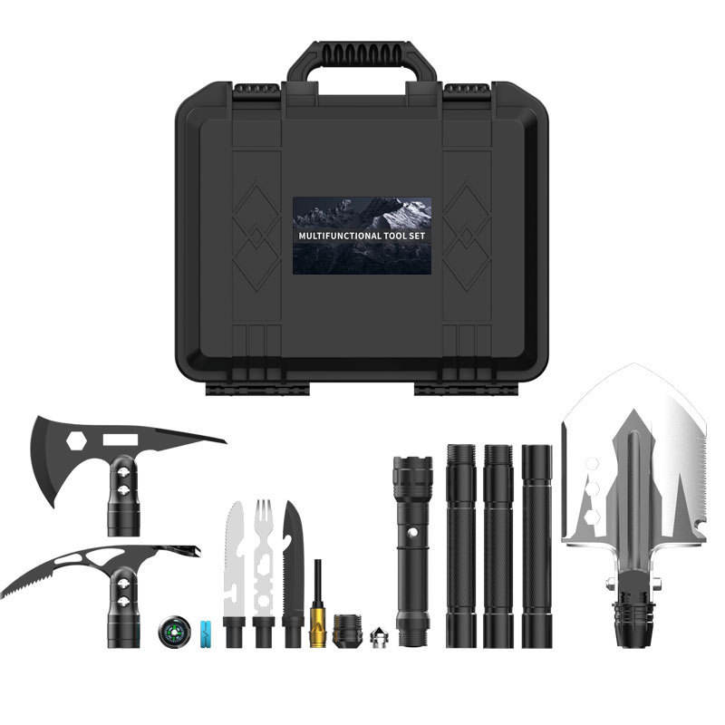 ชุดอุปกรณ์เอนกประสงค์สำหรับการเอาชีวิตรอด ประกอบด้วยพลั่ว มีด ขวาน ส้อม ทำจากอลูมิเนียมอัลลอยด์ สำหรับตั้งแคมป์กลางแจ้งและกรณีฉุกเฉิน