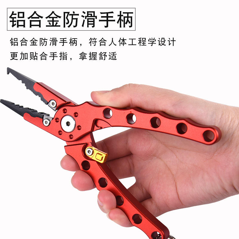 คีมตกปลาอเนกประสงค์อลูมิเนียมอัลลอยด์สีแดงเครื่องตัดสายเอ็นแบบพกพาสำหรับอุปกรณ์ตกปลา