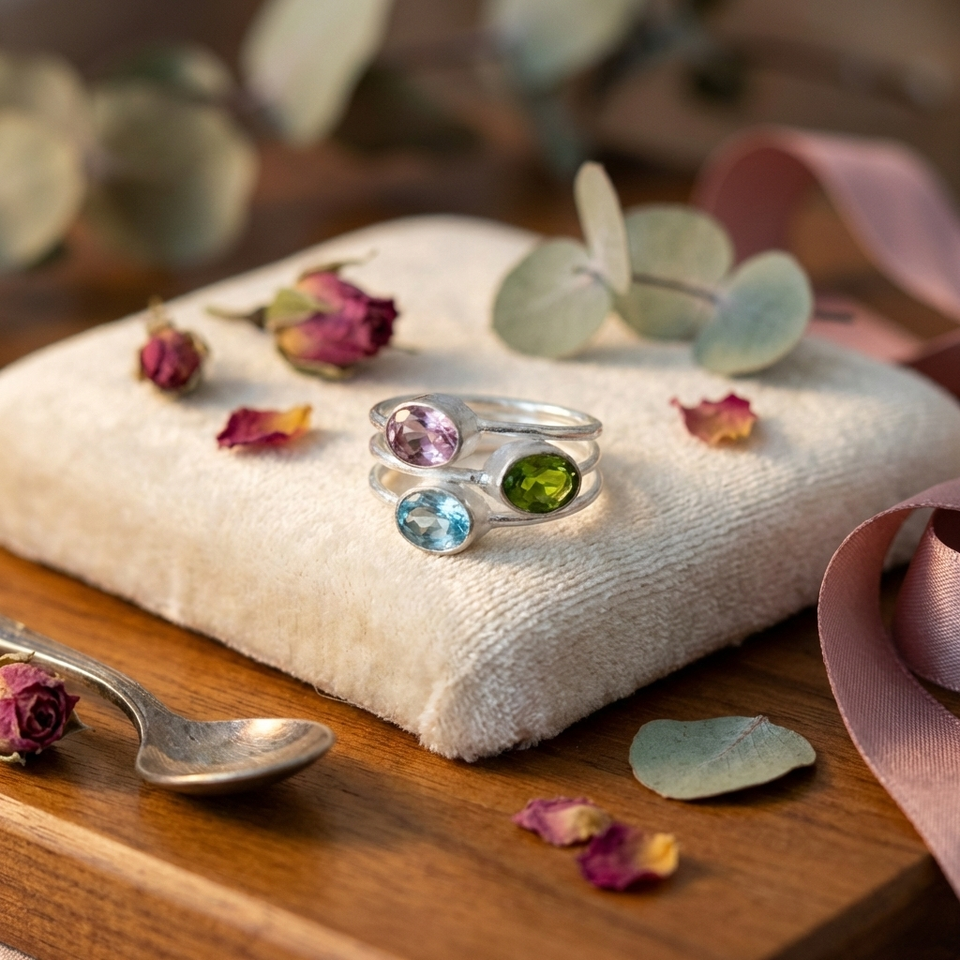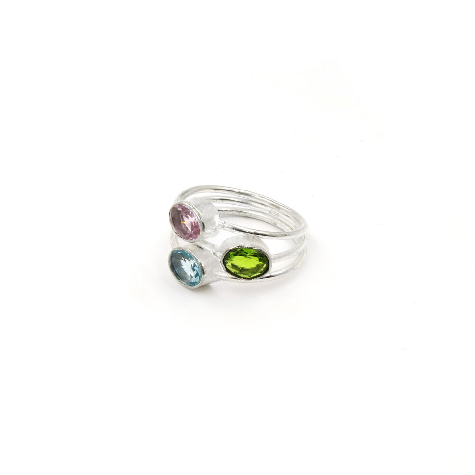 แหวนโบฮีเมียนประดับพลอยหลายชนิด | แหวนทองเหลืองชุบเงินรูปทรงเรขาคณิตประดับบลูโทแพซ เพอริดอต และโรสควอตซ์ทรงวงรี ทำด้วยมือ