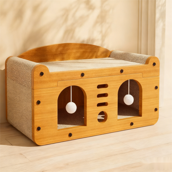 บ้านข่วนแมวไม้หลายชั้น - แผ่นข่วนทำจากใยไซซอลที่ทนทาน, เตียงแมวในร่มและที่พักเล่นพร้อมลูกบอลห้อย
