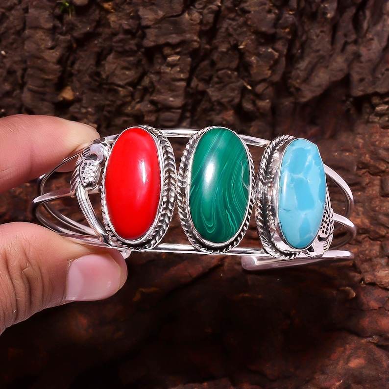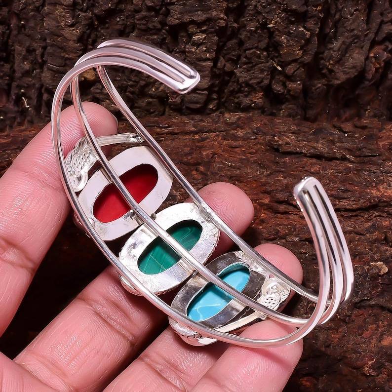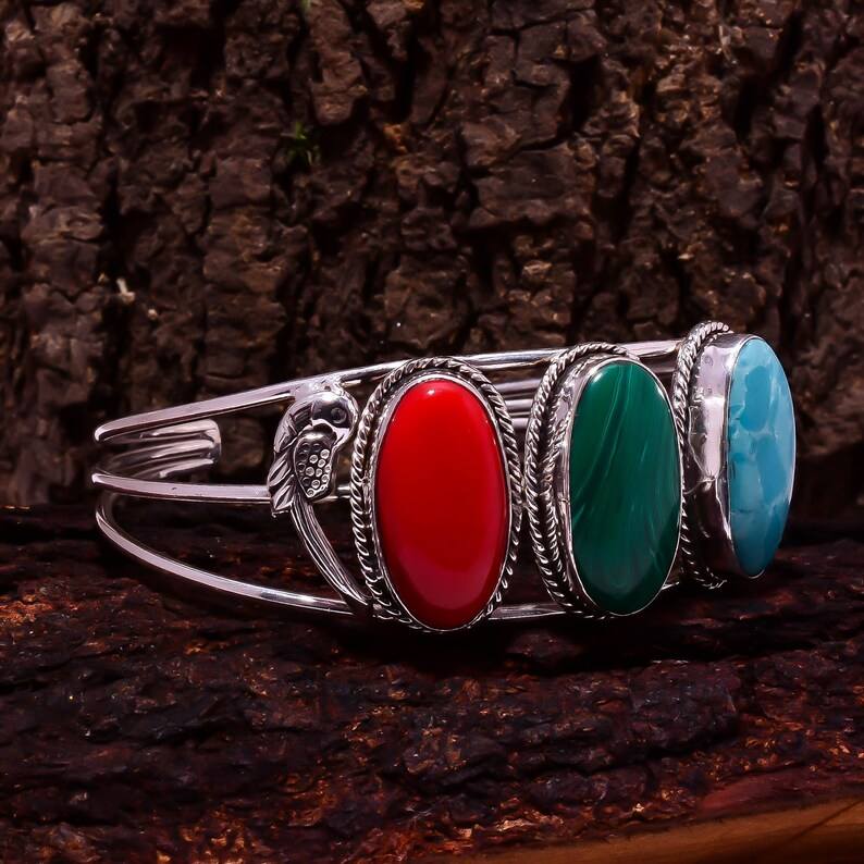 กำไลข้อมือเงินประดับหินหลากชนิด ปะการังแดง มาลาไคต์ ฮาวไลต์ ทำมือ สไตล์โบโฮ เครื่องประดับอัญมณี ของขวัญ