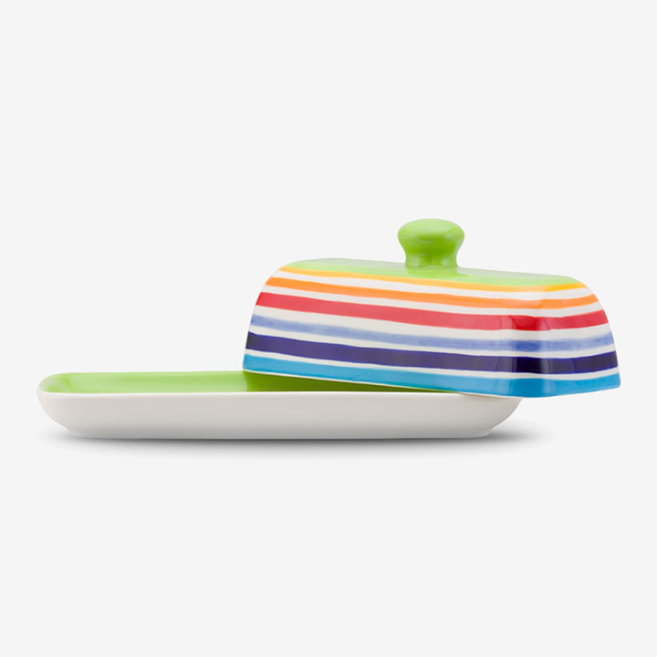 จานเนยเซรามิกลายรุ้งหลายสีที่มีฐานสีเขียวสดใสร่าเริงมีจำหน่ายในราคาขายส่ง