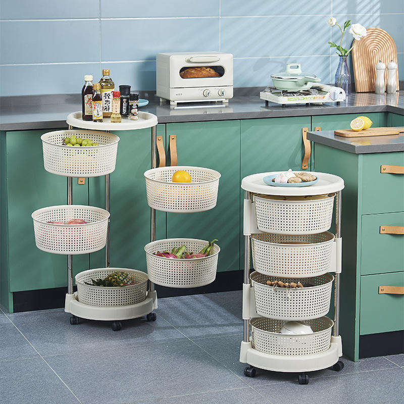 ชั้นวางของพลาสติกหมุนได้ 360 องศา แบบหลายชั้น 3 4 5 ชั้น พร้อมตะกร้าทรงกระบอกสำหรับเก็บผัก มีล้อเลื่อน