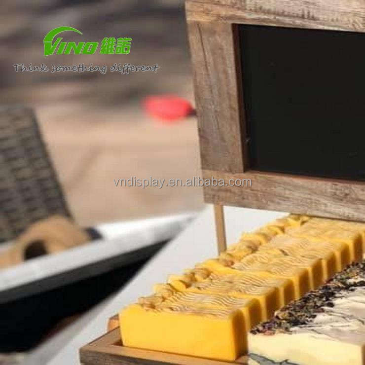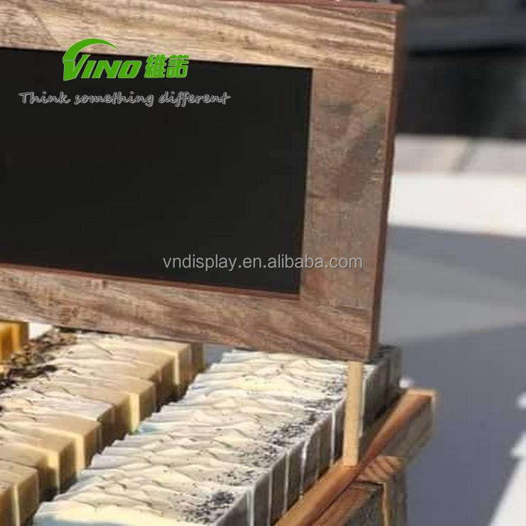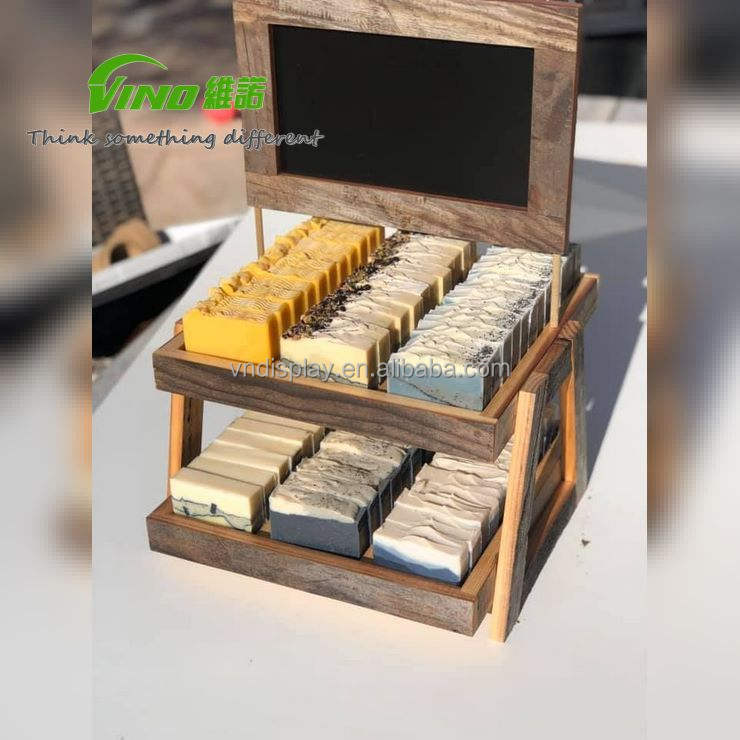 ชั้นวางสบู่ไม้ทำมือหลายชั้นพร้อมกระดานดำสำหรับบูธจัดแสดงสินค้าปลีก